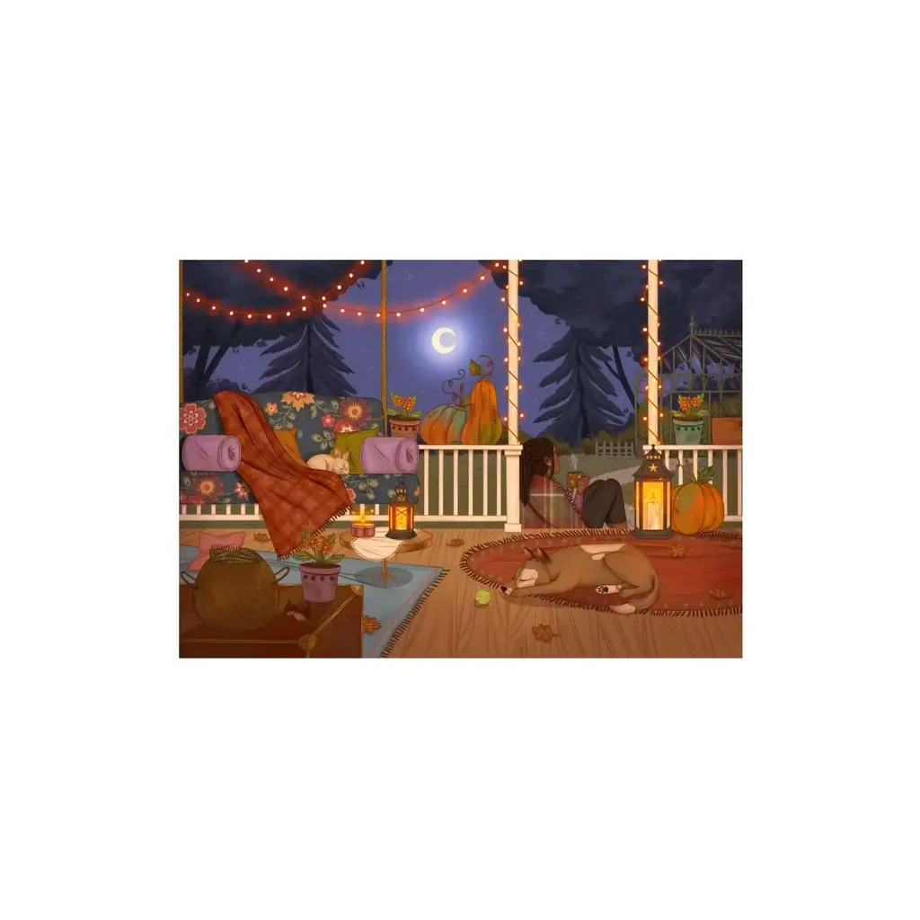 The Autumn Night puzzle is a Trevell puzzle consisting of 1000 pieces. Illustrated by Giulia Varetto, it captures a tranquil autumn evening: a dog and a rabbit rest on the house's terrace, surrounded by autumn decorations and pumpkins. Leaning against the dock, the magic of the night envelops the scene, with warm colors adding to the softness of the moment.