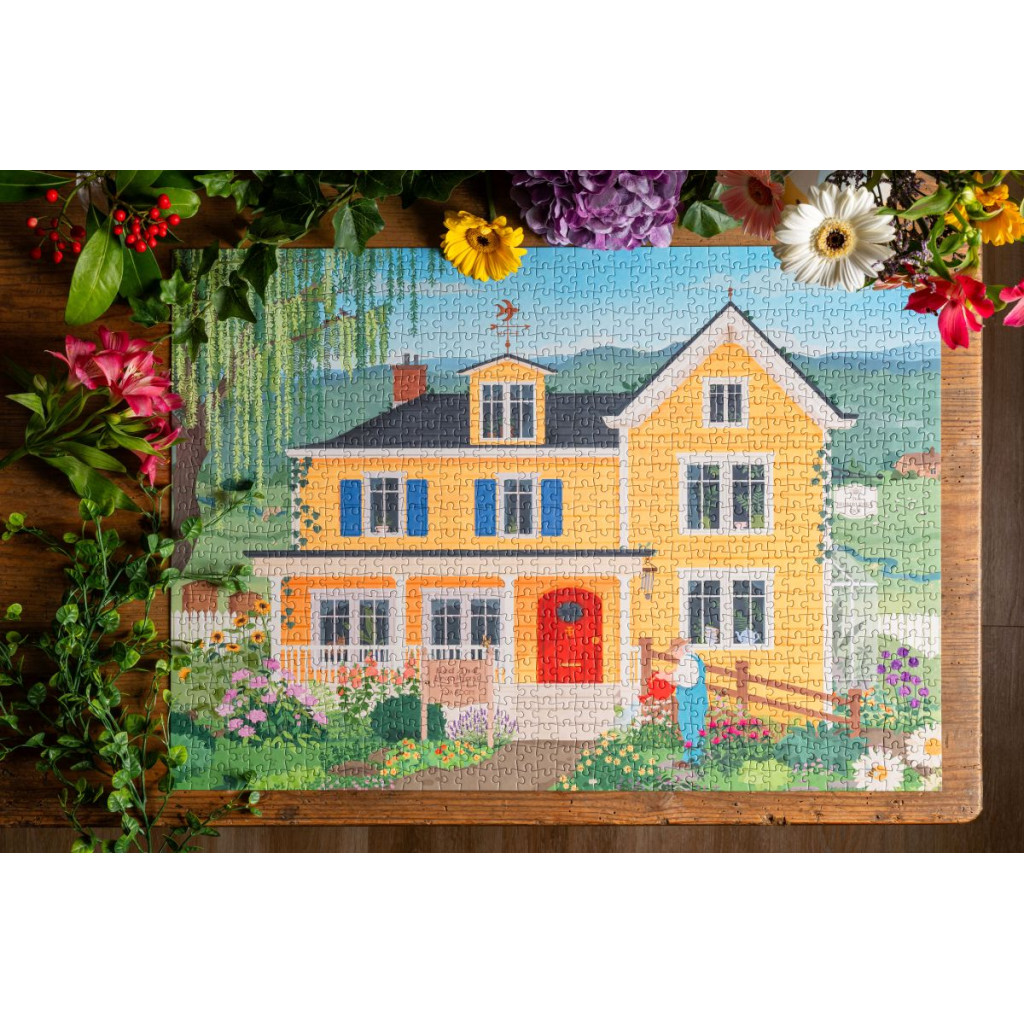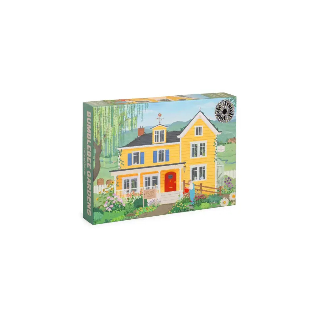 The Bumblebee Gardens puzzle is a Trevell puzzle consisting of 1000 pieces. Illustrated by Nicolle Lalonde, this puzzle invites you into a lovely country inn, a large yellow house nestled in the heart of a colorful and warm landscape.