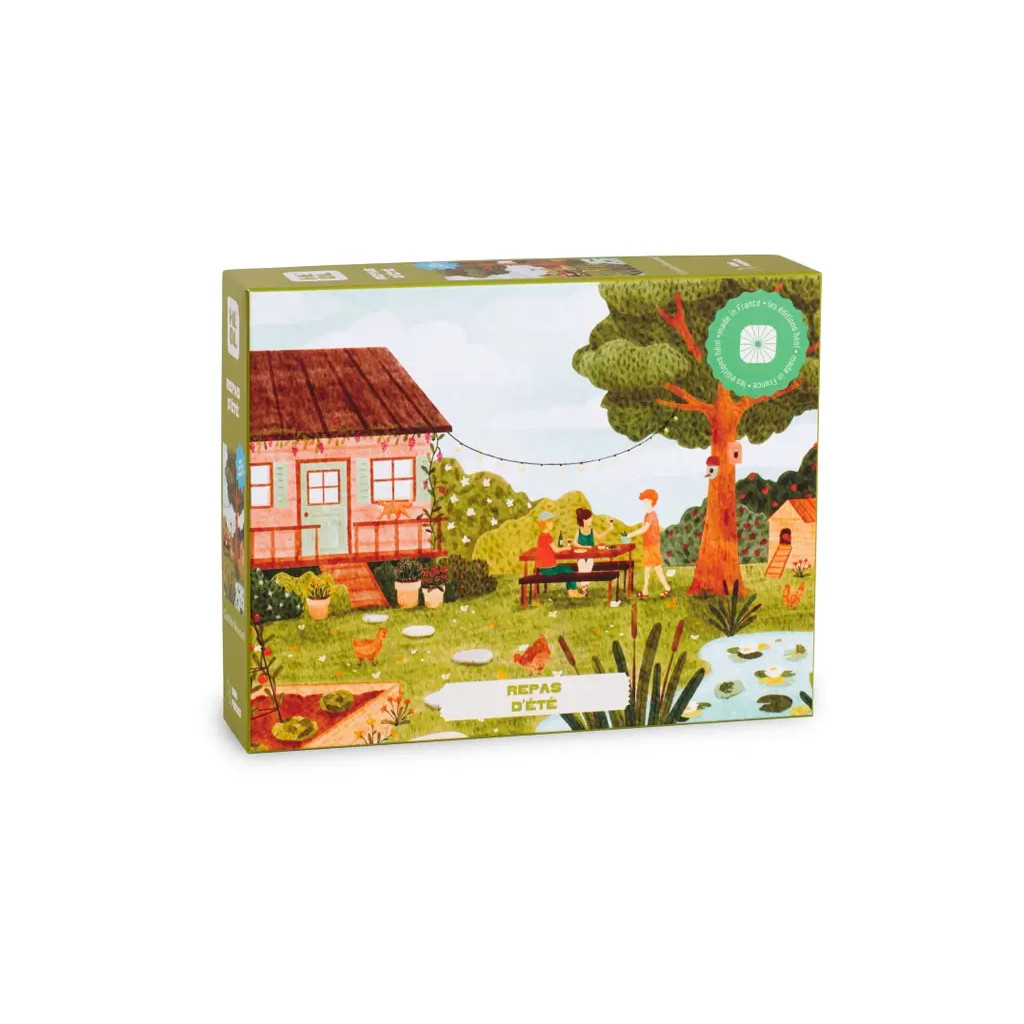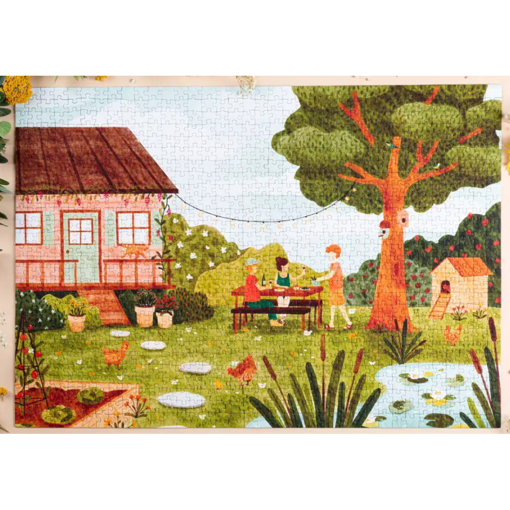 Summer Meal is a puzzle composed of 1000 pieces from the brand Les Éditions Heol. Illustrated by Clotilde Boucard, a French artist, this puzzle invites you to extend summer. Realized in watercolor, this scene takes you into this sweet garden with a vegetable garden, chickens, pretty plants and a good meal in the open air.