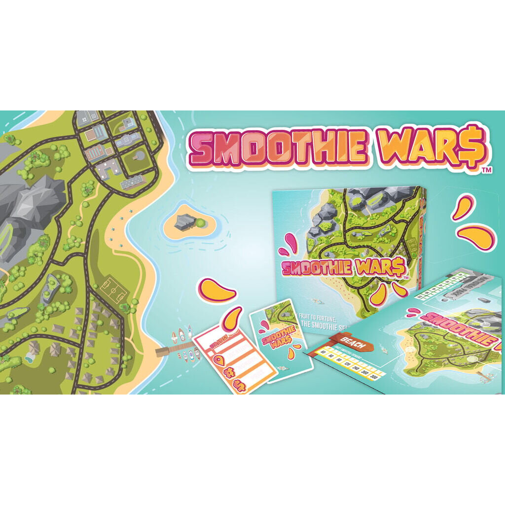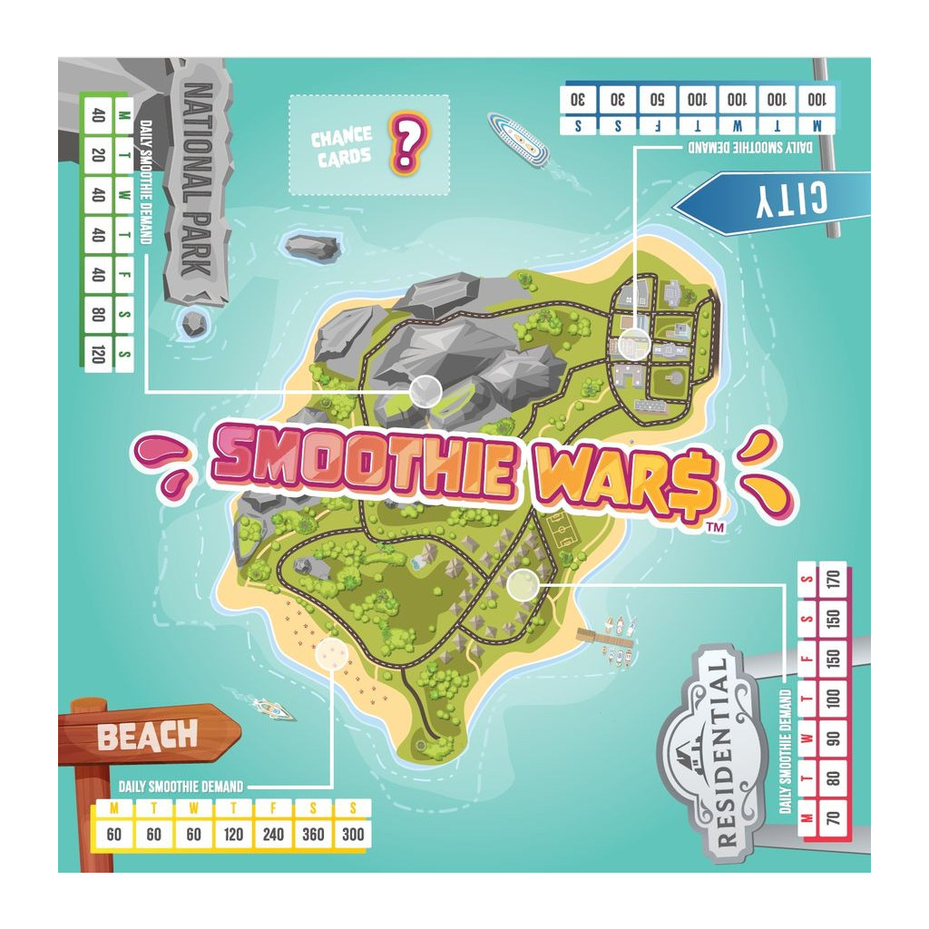 Smoothie Wars is a strategic game in which players compete to sell fresh fruit smoothies at different locations on a tropical island. The game takes place over an imaginary week, with each turn representing one day.