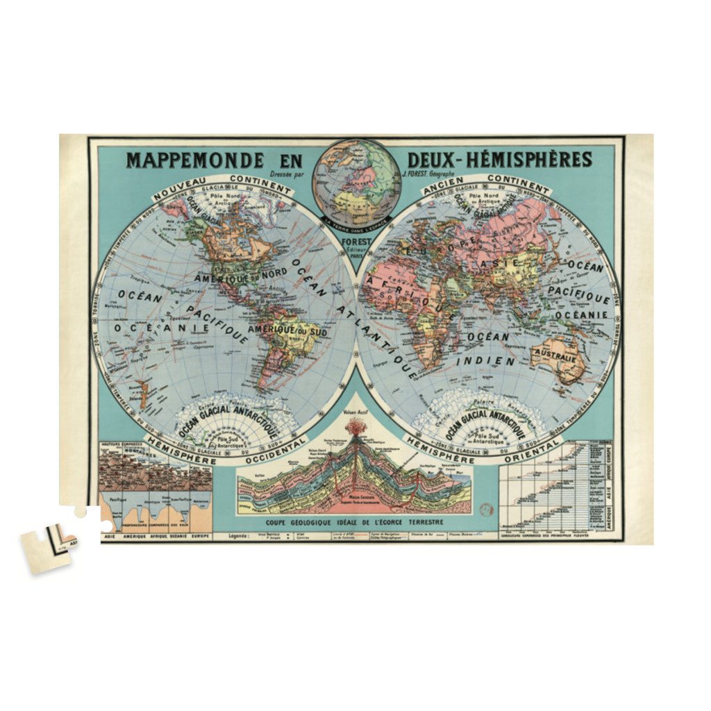 This terrestrial planisphere puzzle shows the two hemispheres, western and eastern, of the Earth as seen from space. This beautiful antique map also features a geological cross-section of the Earth's crust, the heights of mountains and lengths of rivers around the world compared, and the depths of the seas. Its author, Joseph Forest, was a French geographer and cartographer who founded a publishing house specializing in maps and plans, approved by the Ministry of Public Instruction, which supplied schools from 1889 onwards.