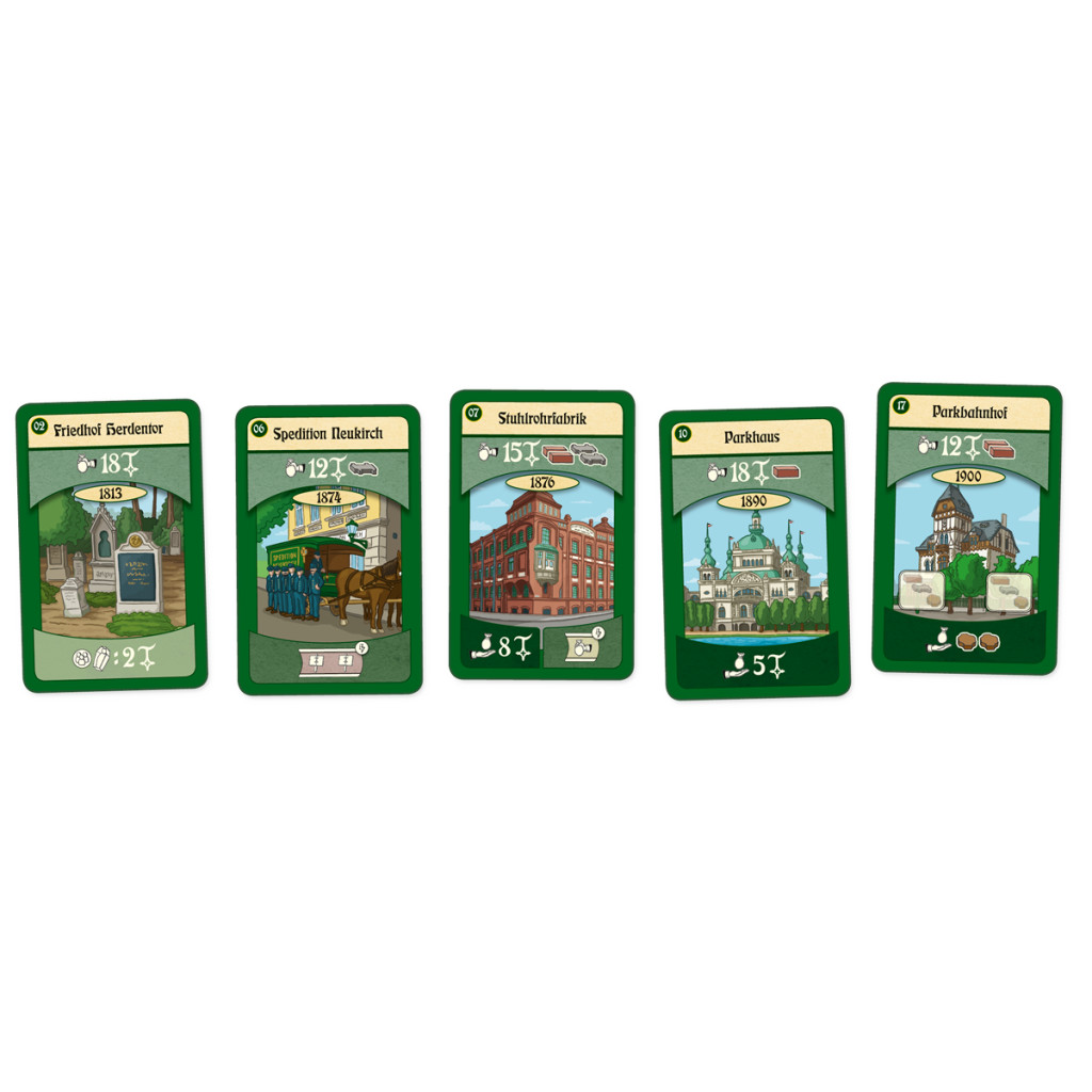 In Findorff, the game, you build up the district of Findorff in the period from 1803 to 1916. Historically, six major railway stations stood in Findorff during this period to connect to Hannover, Hamburg, Oldenburg, and Bremerhaven. While three of them were replaced by a single big main train station, you raise the other three rail stations at one of the two main roadbeds. Besides using boats on the peat canal, this small railway helped to transport even more peat from the bog in the north of Bremen to Findorff. During the first half of the 19th Century, peat was the most important commodity for heating the houses and for supplying energy to the industry. In the late 19th century (and in the game), peat lost its importance once when replaced by the energy-rich coal.