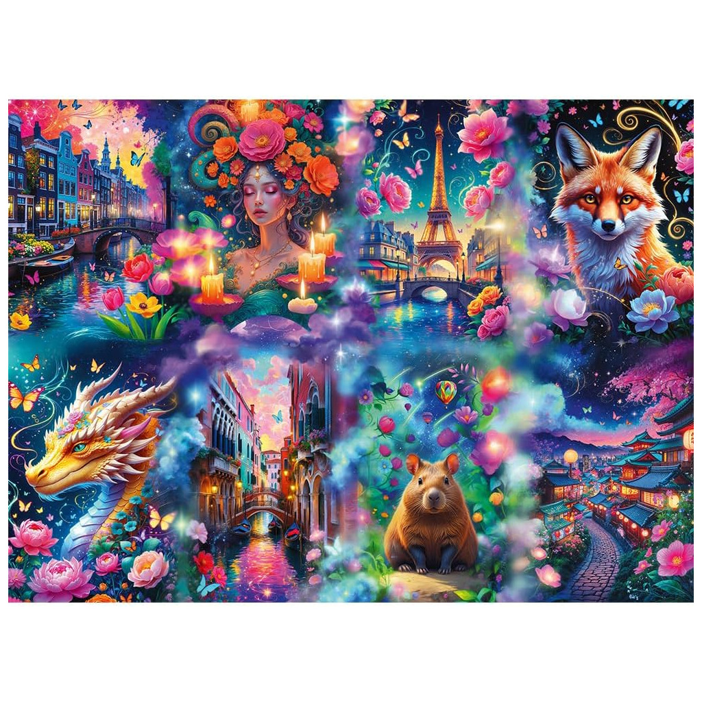 Assemble a large puzzle depicting colorful images of famous animals and buildings! The final image measures 180.5 x 132.5 cm. It consists of 8 puzzles of 1000 pieces each. The package also contains instructions and a large poster that will help you assemble the puzzle.