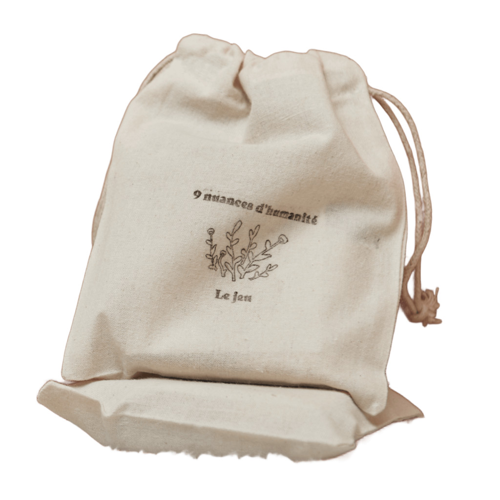 Measuring 7x7cm, it's easy to take with you wherever you go! It comes with a rule book in a hand-stamped raw cotton pouch: each copy is unique.