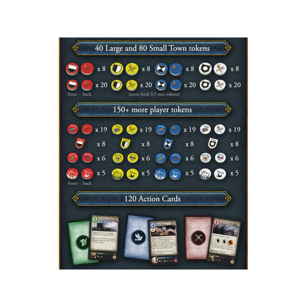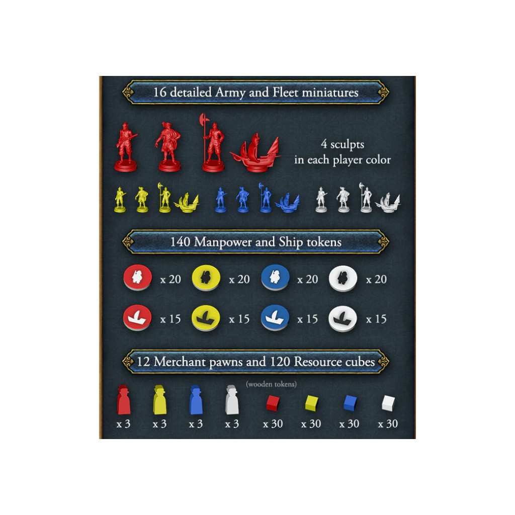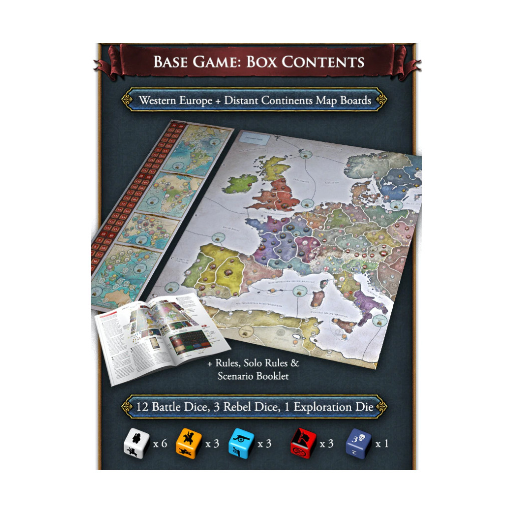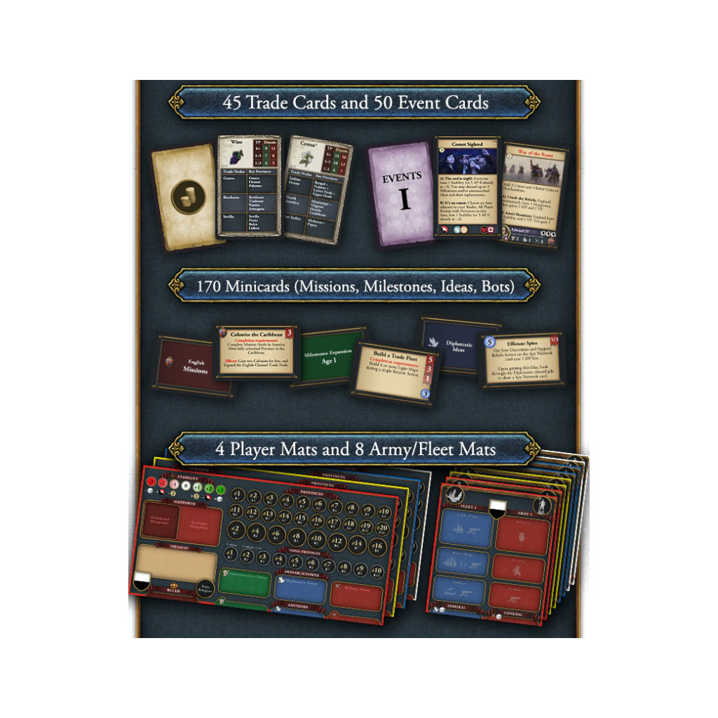 Through strategic use of cards and careful management of resources you can expand your realm on the map board, while at the same time developing the internal machinery of the state on your player board. You must build diplomatic relations that support your ambition and you can explore far-away parts of the world. By recruiting skilled advisors and carefully investing monarch power in great ideas, province development, and long term strategies, you may well be able to outshine your historical counterparts.