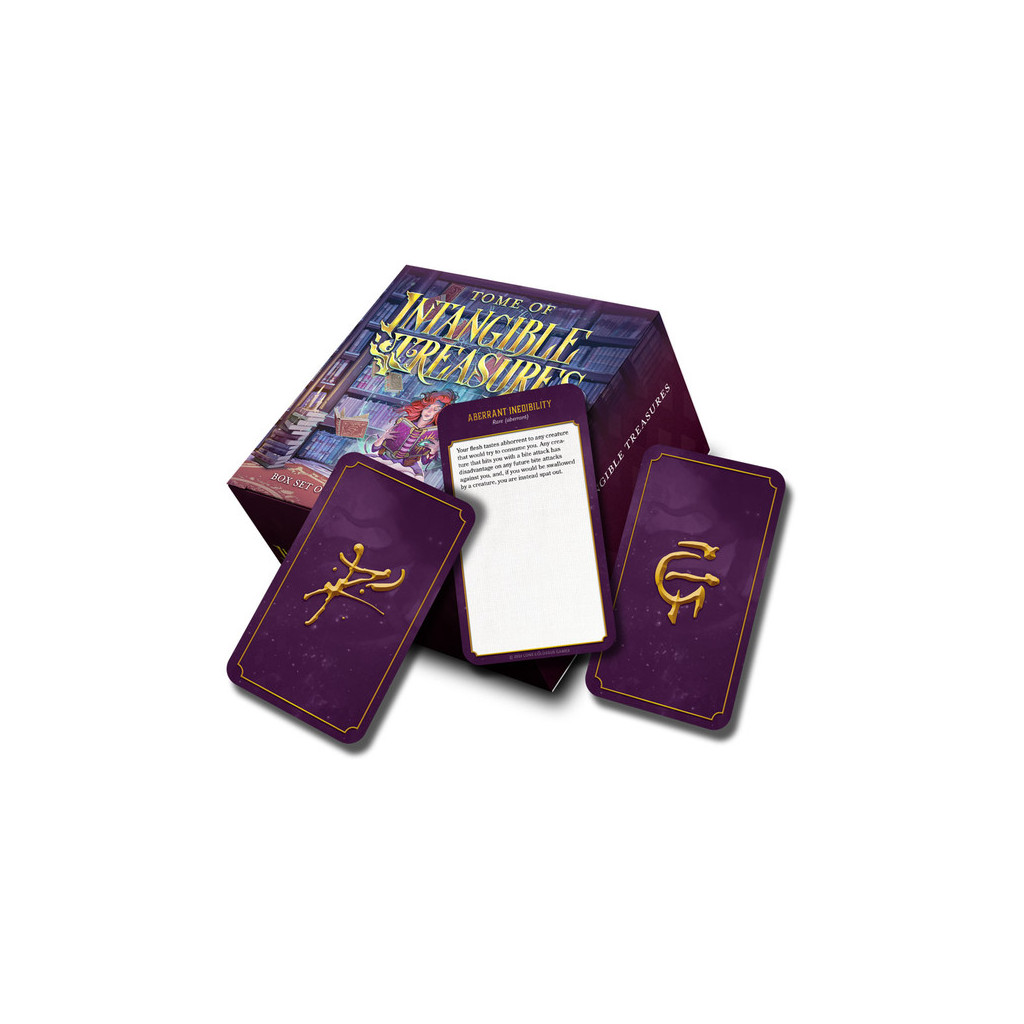 Intangible Treasures Card Box Set 5E includes 380 tarot-sized reference cards compatible with the 5th edition for each of the blessings, charms, and pacts featured in the Tome of Intangible Treasures.