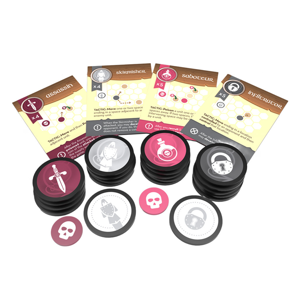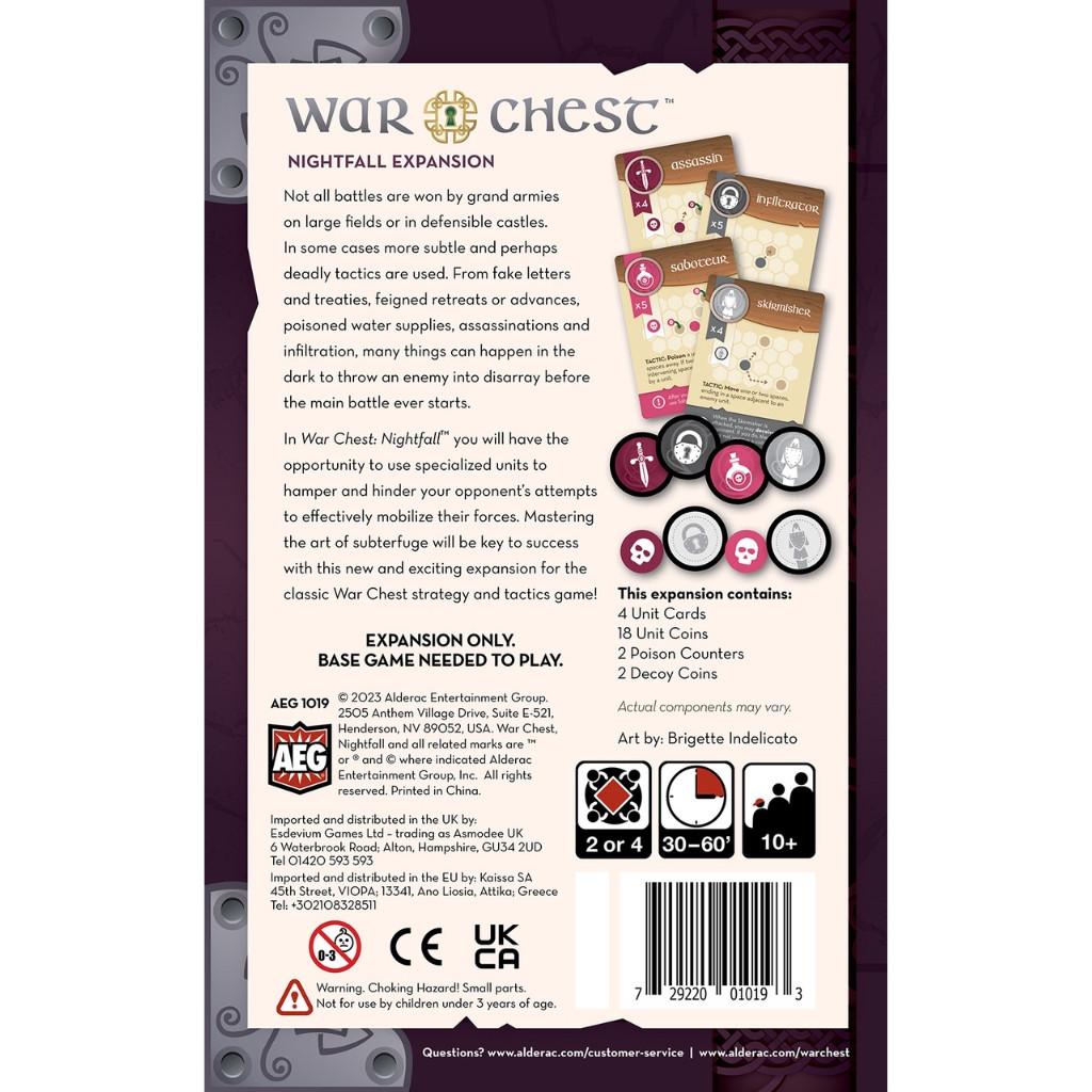 In War Chest: Nightfall you will have the opportunity to use specialized units to hamper and hinder your opponent's attempts to effectively mobilize their forces. Mastering the art of subterfuge will be key to success with this new and exciting expansion for the classic War Chest strategy and tactics game!