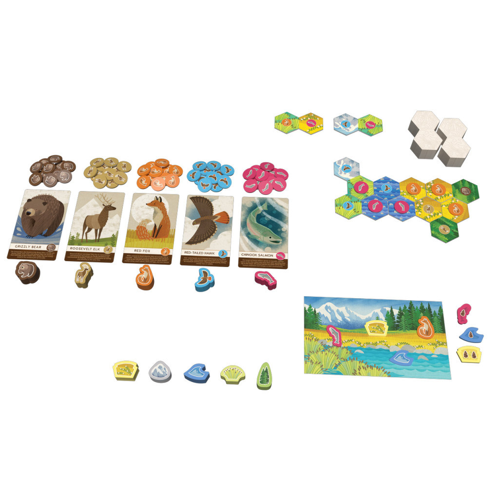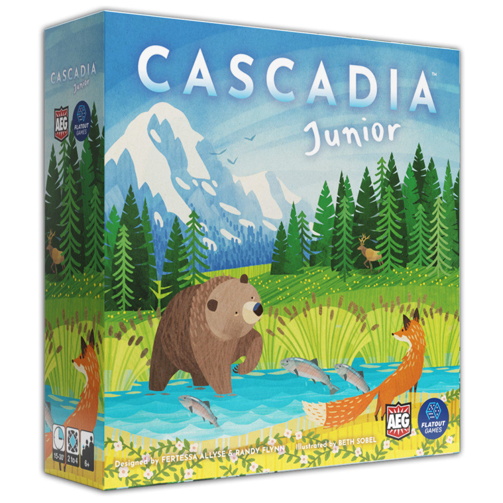 Cascadia Junior takes younger players on an adventure through the wilderness of the Pacific Northwest! In this game, based on the award-winning Cascadia, players build their own panoramic maps by matching animals and habitats to score points. This junior version helps children ages 6+ develop pattern recognition, set collection, and basic addition skills while learning about the diverse animals in the area, such as bears, elk, foxes, hawks, and salmon!