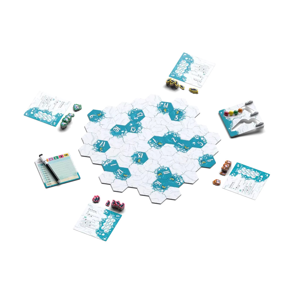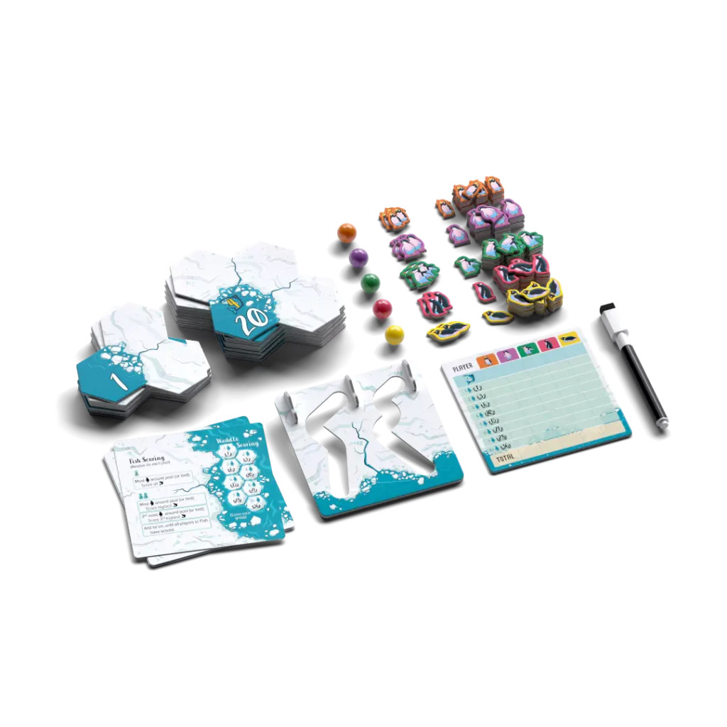 Strategically place your penguins to form groups and claim fish to score the most points! Turn order matters a lot; in Waddle, it’s tracked by marbles on a two-column track!