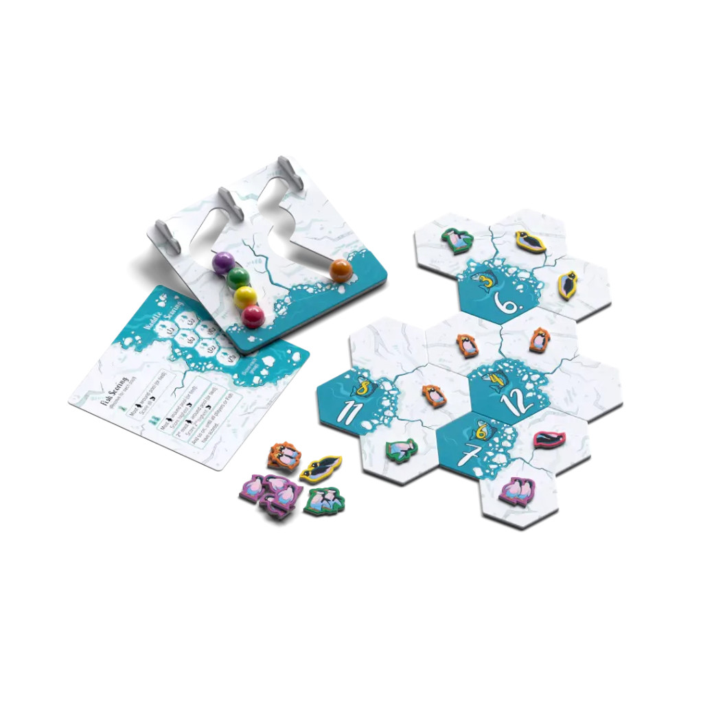 “Place a Penguin” onto any unoccupied hex adjacent to the lowest numbered water hex. Then, pick up your marble and place it on the top of the same Turn Tracker column
