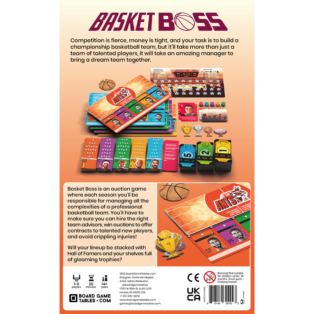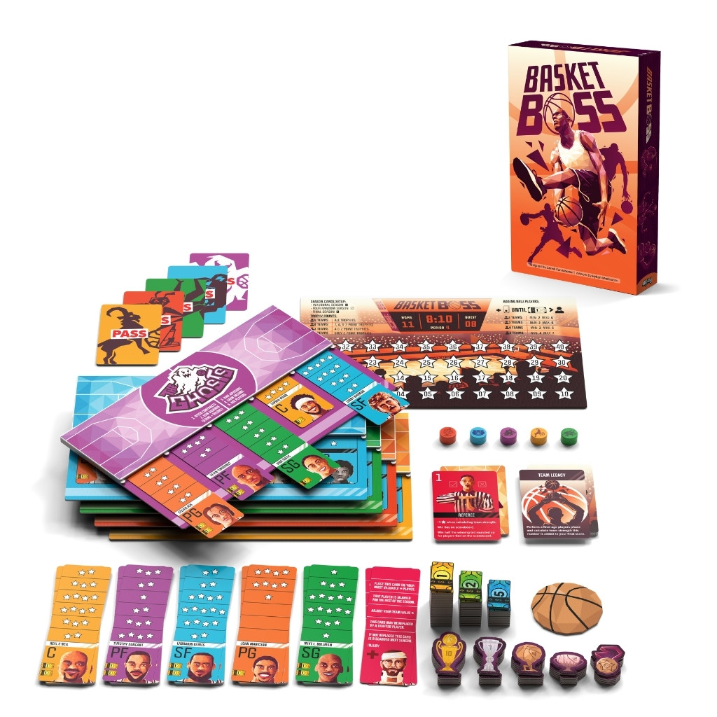 Step into the shoes of a basketball team manager with BasketBoss, a competitive auction strategy game for 2-5 players. Each season, bid on superstar players, hire strategic advisors, and manage critical decisions like injuries and budgets to guide your team to victory. With dynamic auctions and multiple viable strategies, no game will ever feel the same. Can you build a basketball dynasty worthy of the Hall of Fame?