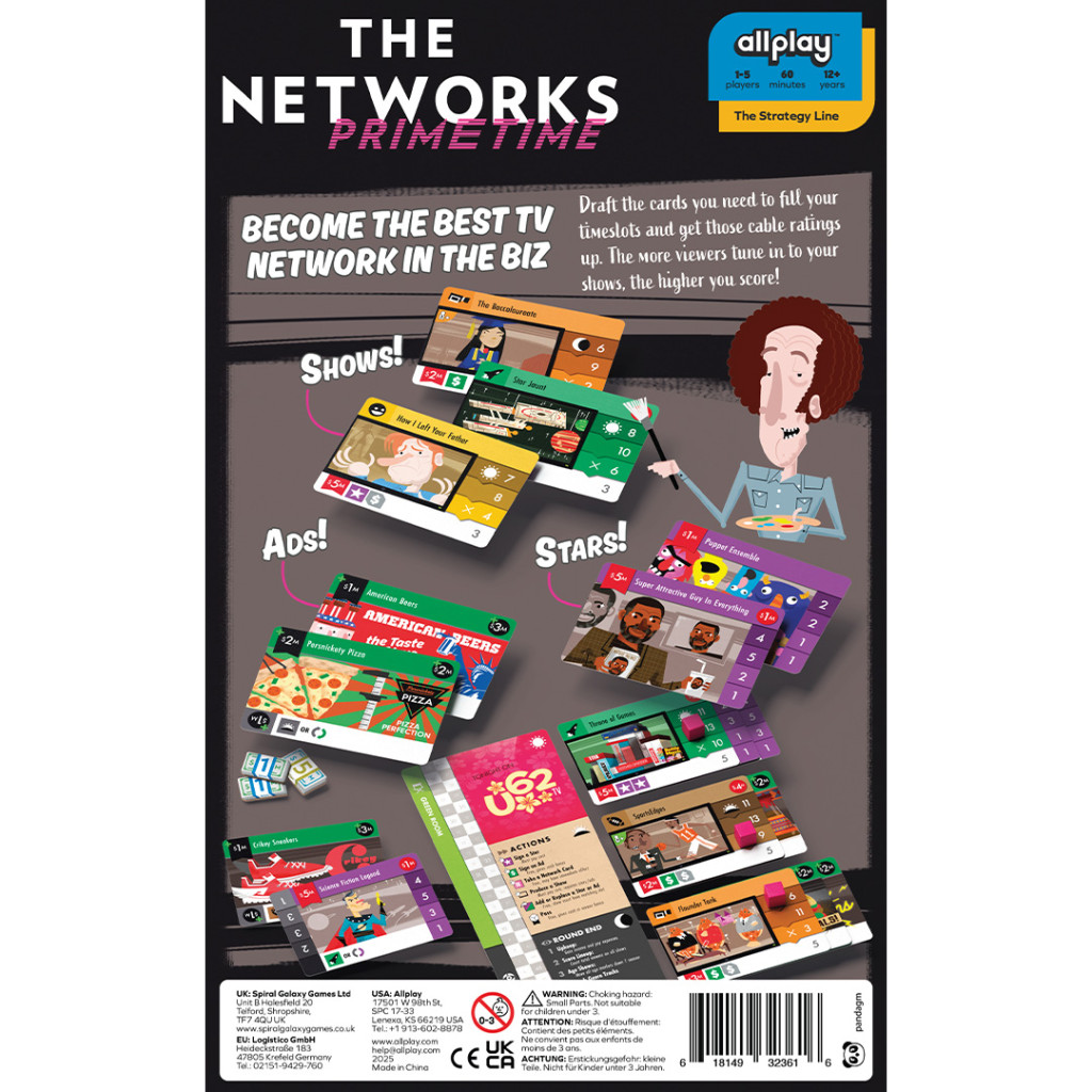 The Networks: Primetime is the redeveloped and streamlined edition of Gil Hova’s acclaimed 2016 strategy game, putting you in charge of your own cable TV network. Over four rounds, draft new shows, hire stars, and secure ad revenue to attract the most viewers and rise to the top of the ratings. With a clever balance of card drafting and resource management, every choice matters as you fight to dominate primetime. Featuring updated rules, solo mode support, and a rich set of components, The Networks: Primetime delivers hours of strategic entertainment for 1-5 players in just 60 minutes.