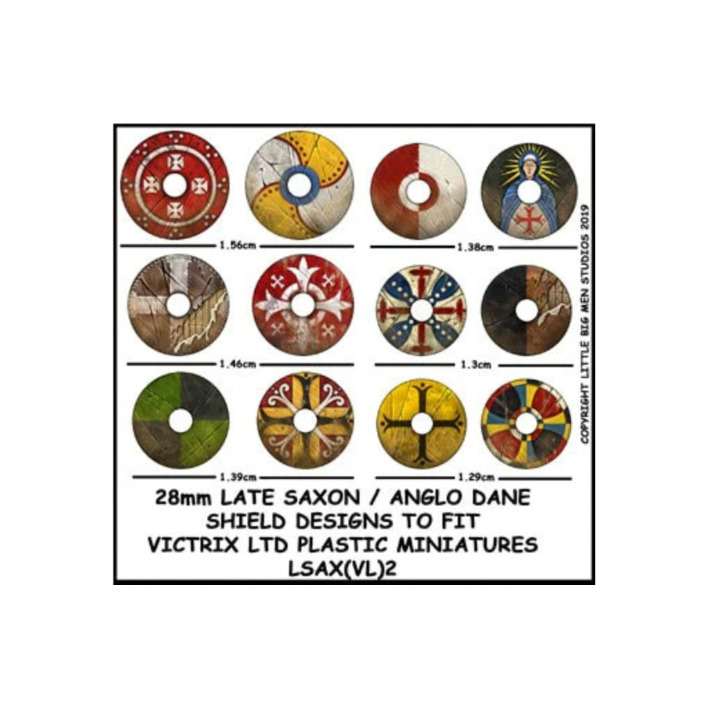 This set contains a sheet of 12 Late Saxon / Anglo Dane shield decals, designed for use with Victrix Anglo Ssxons / Danes miniatures.