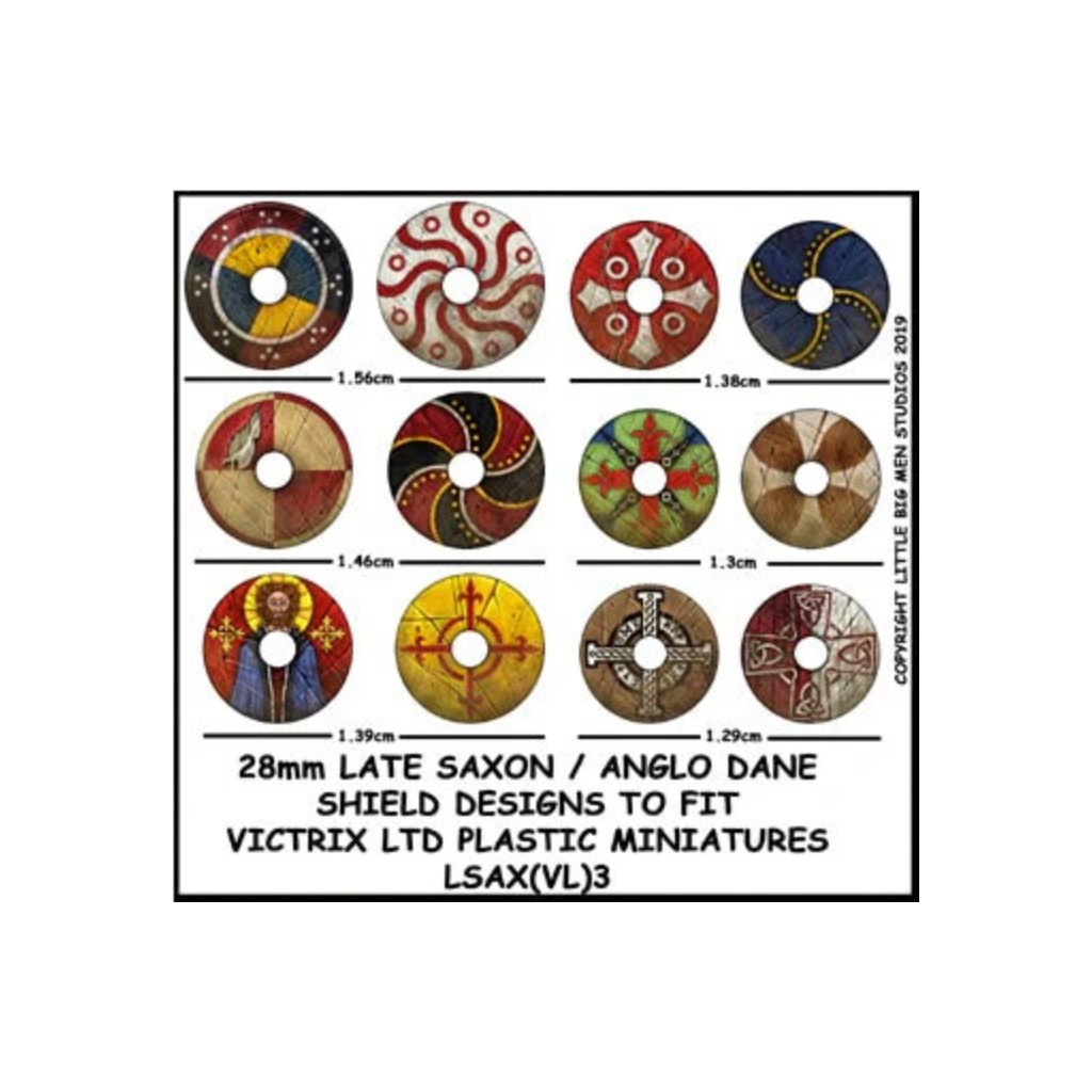This set contains a sheet of 12 Late Saxon / Anglo Dane shield decals, designed for use with Victrix Anglo Ssxons / Danes miniatures.