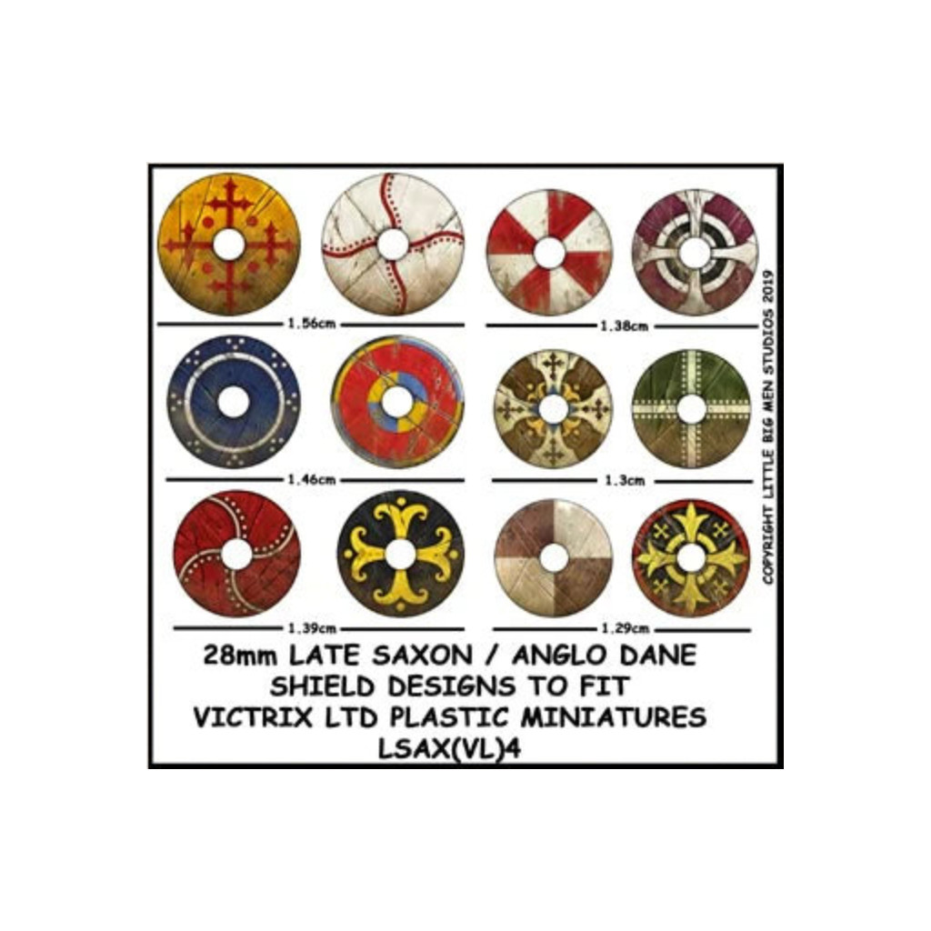 This set contains a sheet of 12 Late Saxon / Anglo Dane shield decals, designed for use with Victrix Anglo Ssxons / Danes miniatures.