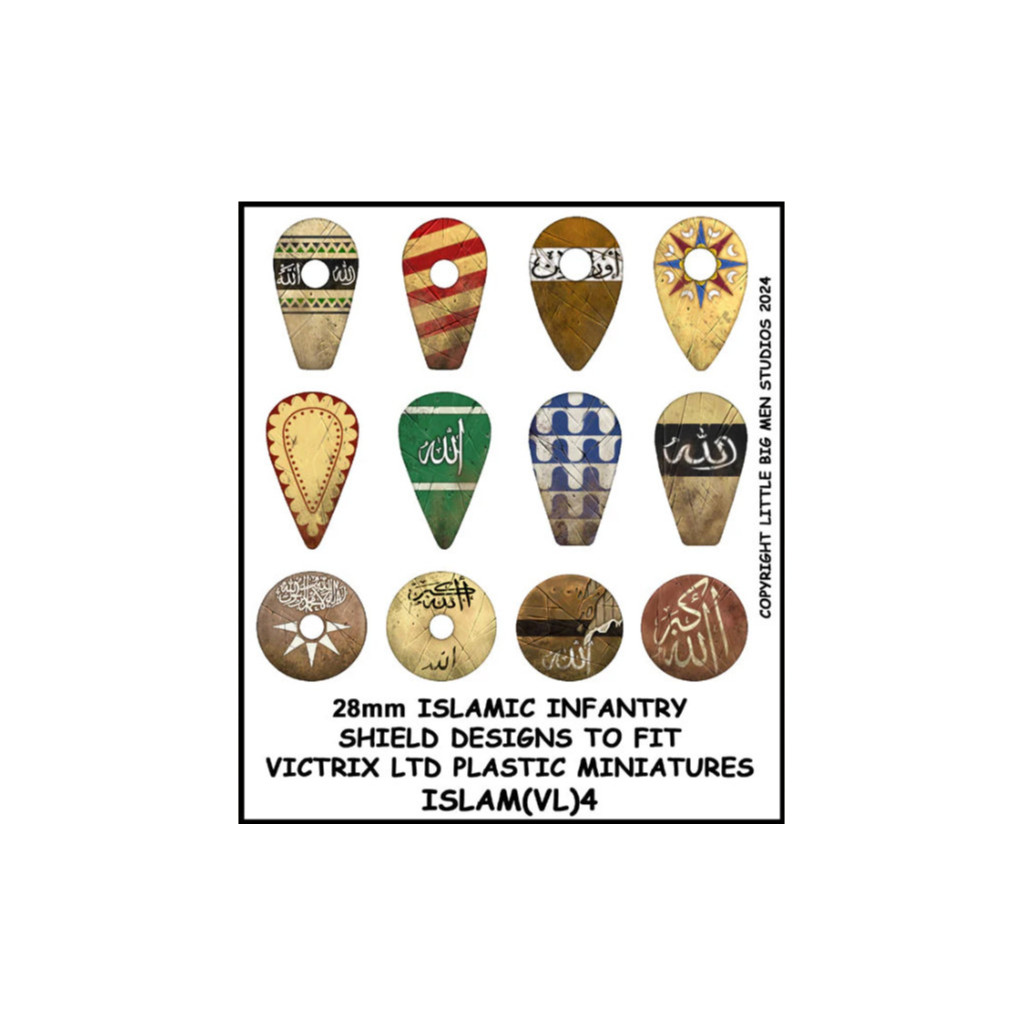 This set contains a sheet of 12 islamic shield decals, designed for use with Victrix islamic infantry miniatures.