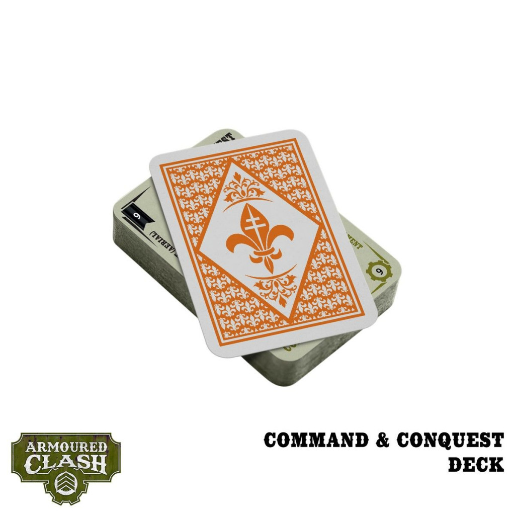 In games of Armoured Clash these faction-themed cards allow players to issue Commands, claim Conquests, and score Victory Points. In short, they are a General's key to victory. But use them wisely. For your enemy will have these same tools at their command...