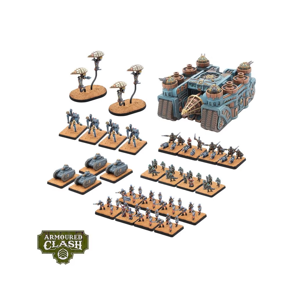 Armoured Clash is a 10mm scale tabletop wargame that uses highly detailed miniatures to represent ranks of infantry, squadrons of armoured vehicles, and huge fighting machines known as Behemoths. Pick your Faction, and fight for dominance in wars waged across this alternate late-Nineteenth Century, and determine the future of the Dystopian Age!
