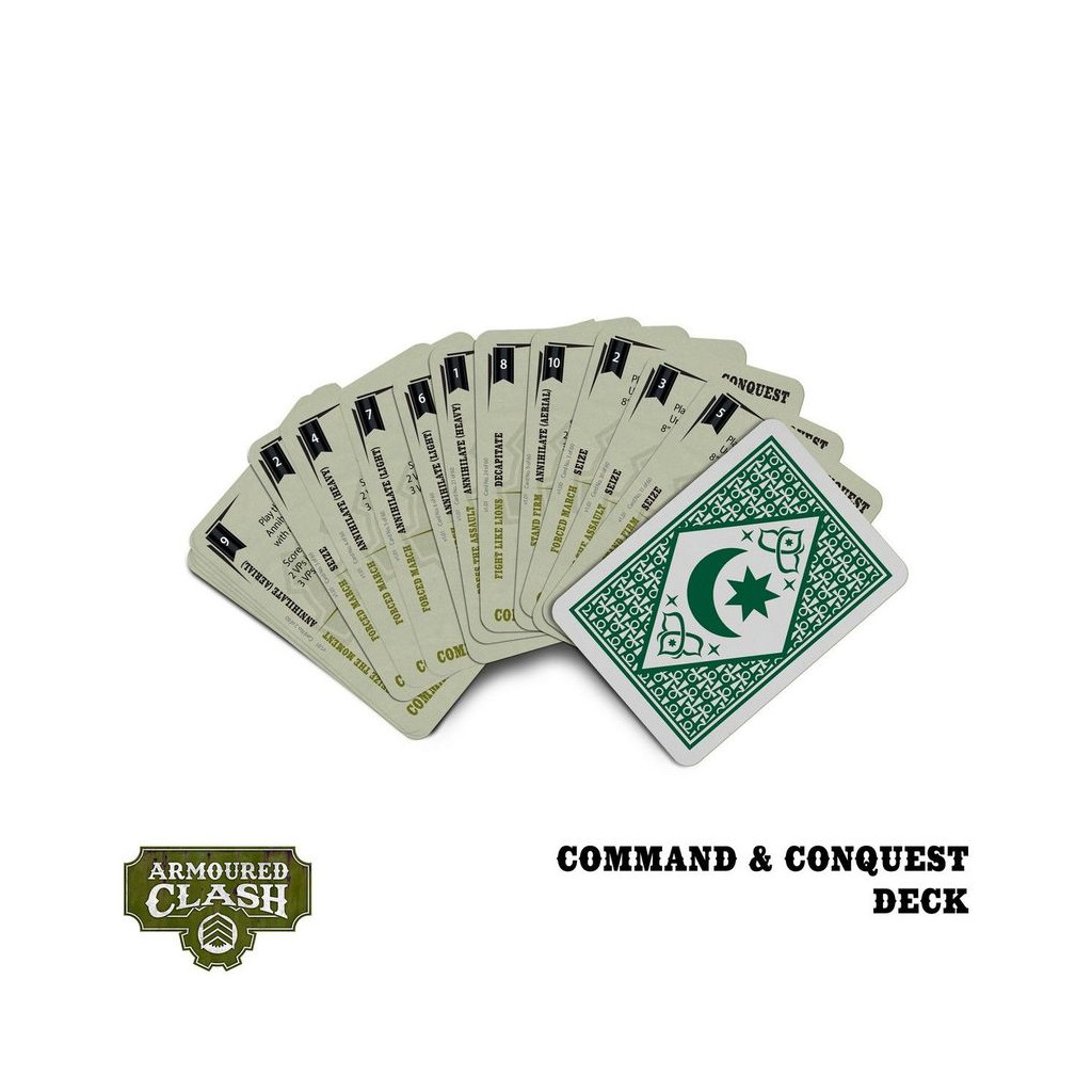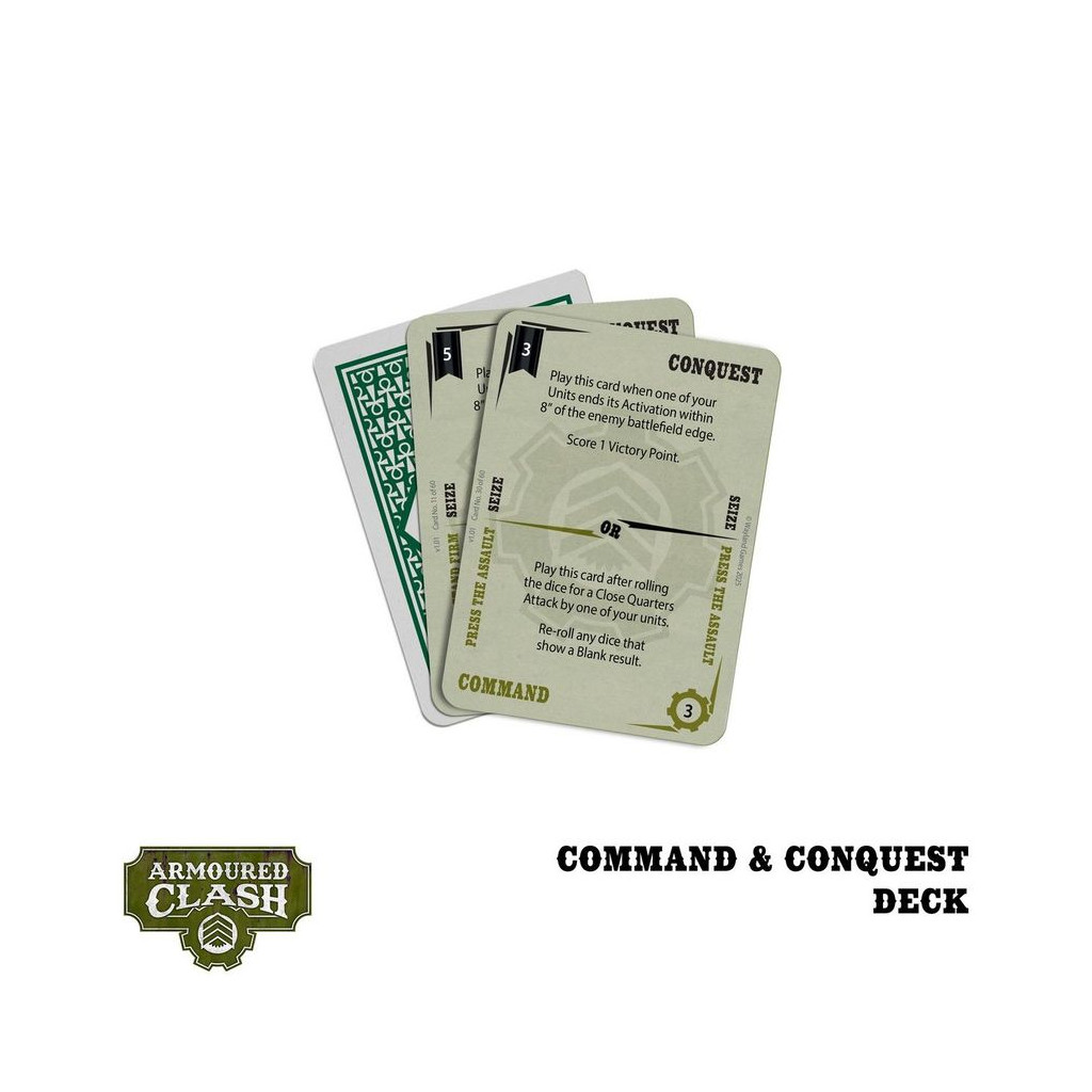 In games of Armoured Clash these faction themed cards allow players to issue Commands, claim Conquests, and score Victory Points. In short, they are a General’s key to victory. But use them wisely. For your enemy will have these same tools at their command…