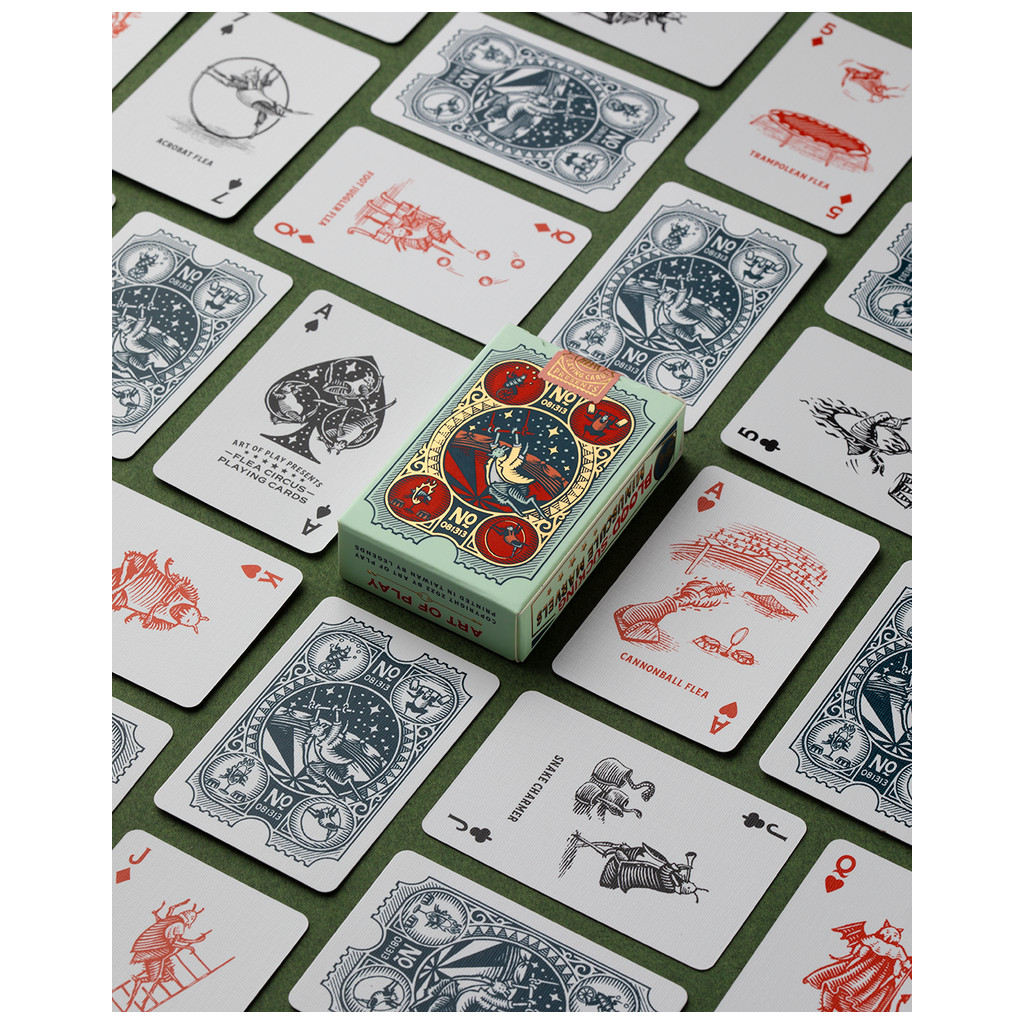 Art of Play's Flea Circus miniature playing cards feature whimsical illustrations celebrating the most astounding acts of a legendary "flea" circus. From death-defying stunts to hilarious antics neither ant nor tic would dare, you'll be scratching your head about how they did it.