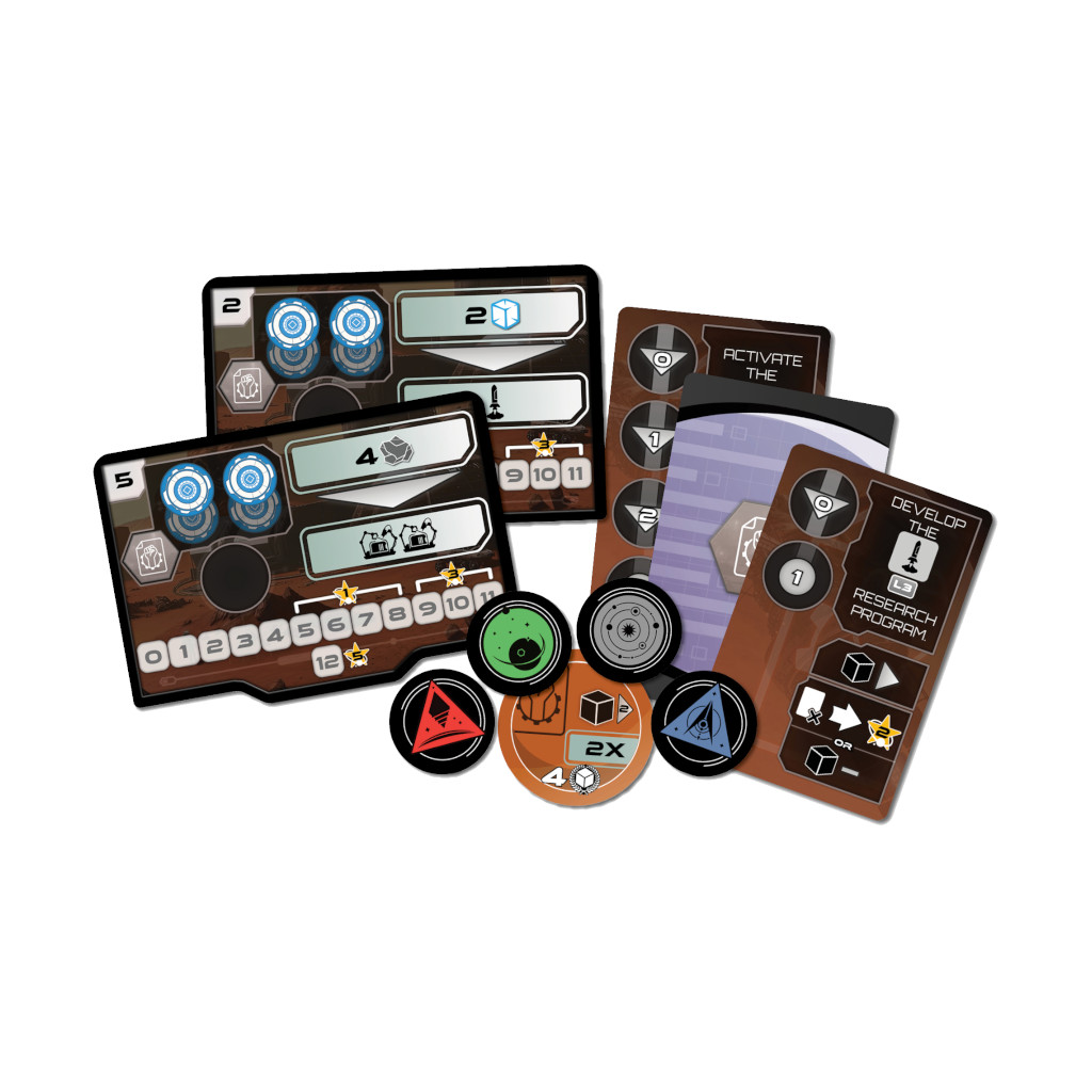 In this expansion the union tiles are introduced. Players may use their leader tokens to take contract cards from the union tiles that provide them with some small objectives that can be fulfilled by following certain paths of development or use specific actions through the game.