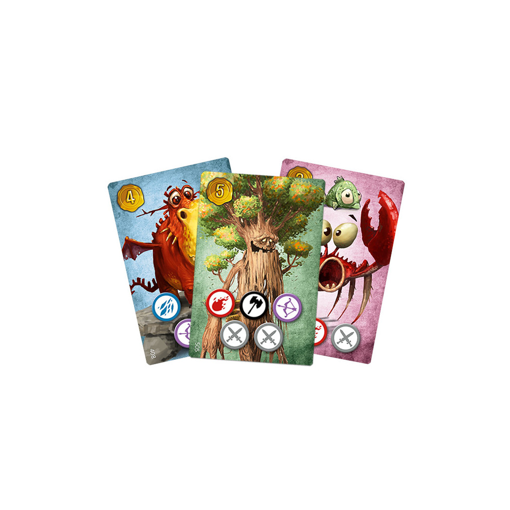 Each player has a face-down pile of cards in front of them with weapons and spells. There are 3 monster card piles at the center of the table, each with a revealed card in front of it. Each monster requires a different combination of weapons and/or spells to be captured. The players, one by one, reveal cards from their piles. As soon as the cards revealed by all the players meet the requirements of one of the monsters, they must quickly place their hand on it. The first player to do so, captures the monster and gets to score its points. If a player tries to capture a monster without all the requirements met, they get a negative point instead. A new card is then revealed and a new round begins. When one of the piles runs out of monster cards, the game is over and the player with the most points wins.