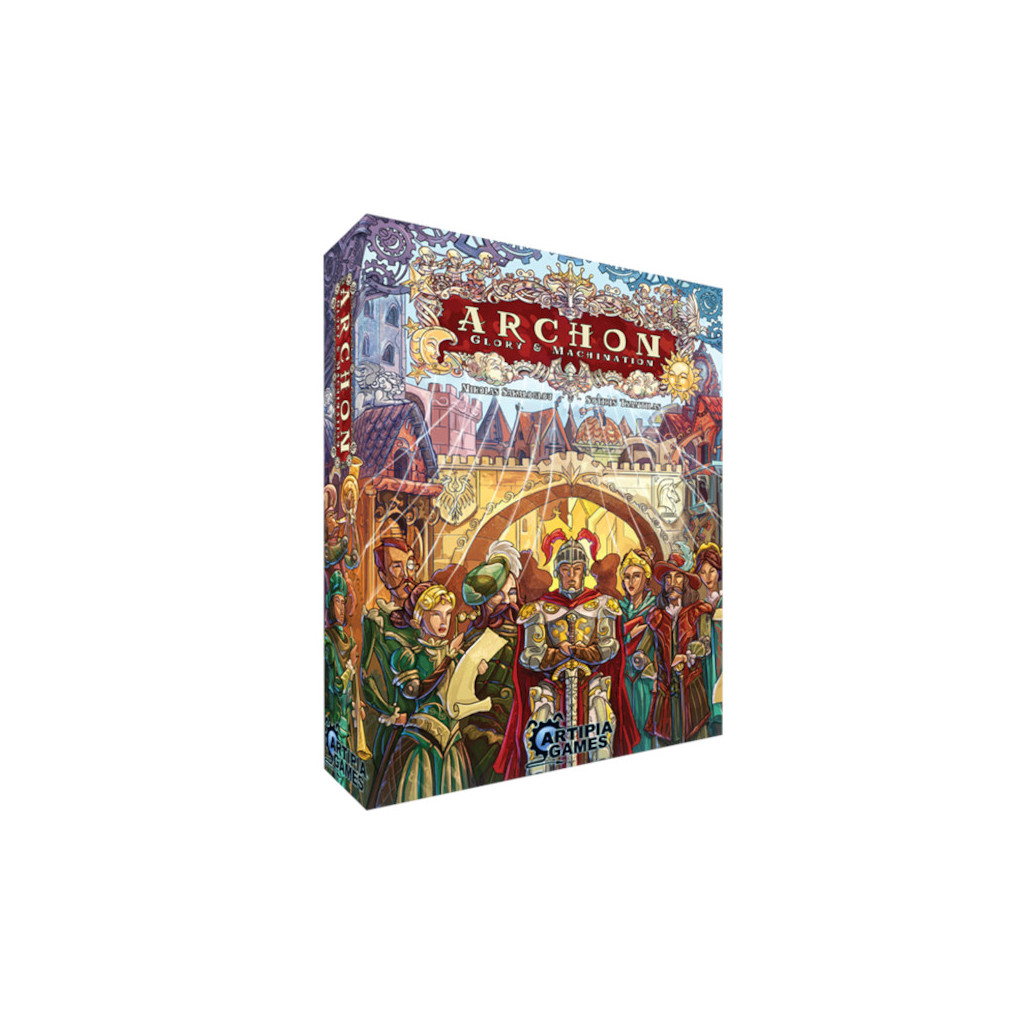 In Archon: Glory & Machination, players are powerful Archons who support Cardis in order to win King’s favor. Players use their influence on their Courtiers and on various figures of authority (Magisters). Each game consists of three Seasons. For each of these Seasons, the King issues different demands that players must fulfill in order to score Victory Points. Each season consists of 3 rounds during which players use a card-driven worker placement mechanism to perform various actions that will allow them to gather resources and income, recruit soldiers and, rebuild the city, and acquire scoring cards (Science & Arts). They will also have the chance to train Elite Warriors to assist in the city’s defense. After nine rounds, the game ends and the player with the most Victory Points wins.