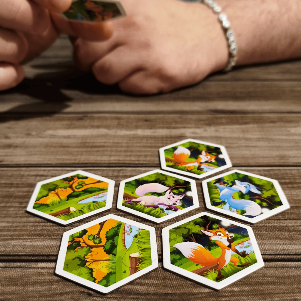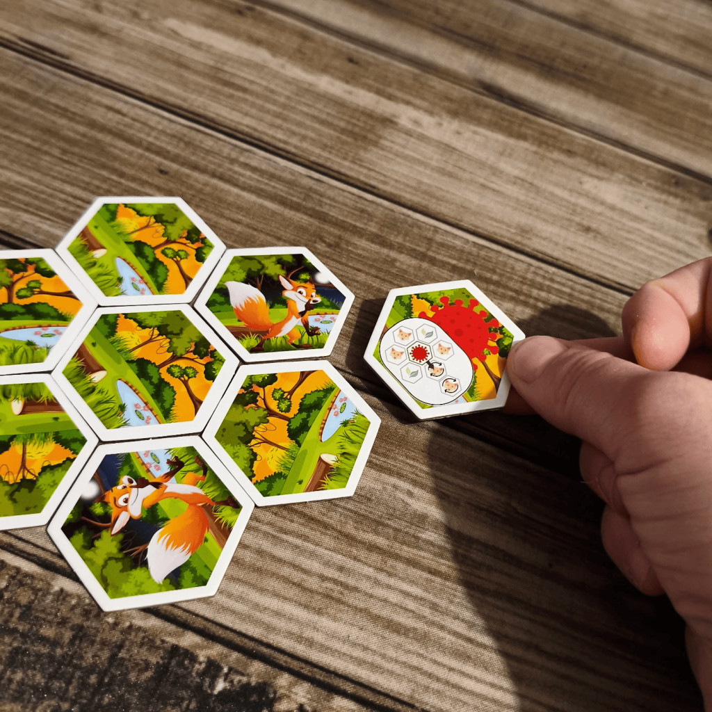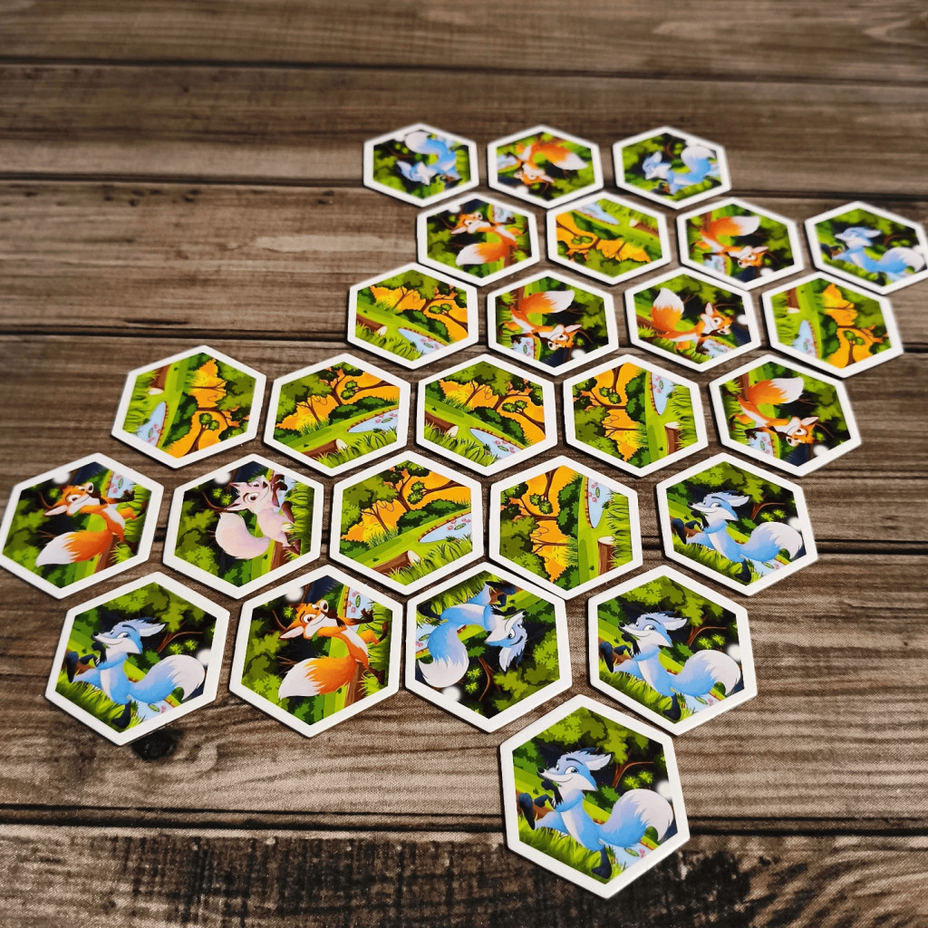 - The player draws a tile, looks at it, and places it against at least two other tiles (nature, fox, or event side). If the tile is placed event side up, the player applies its effect and repositions it to nature side up.