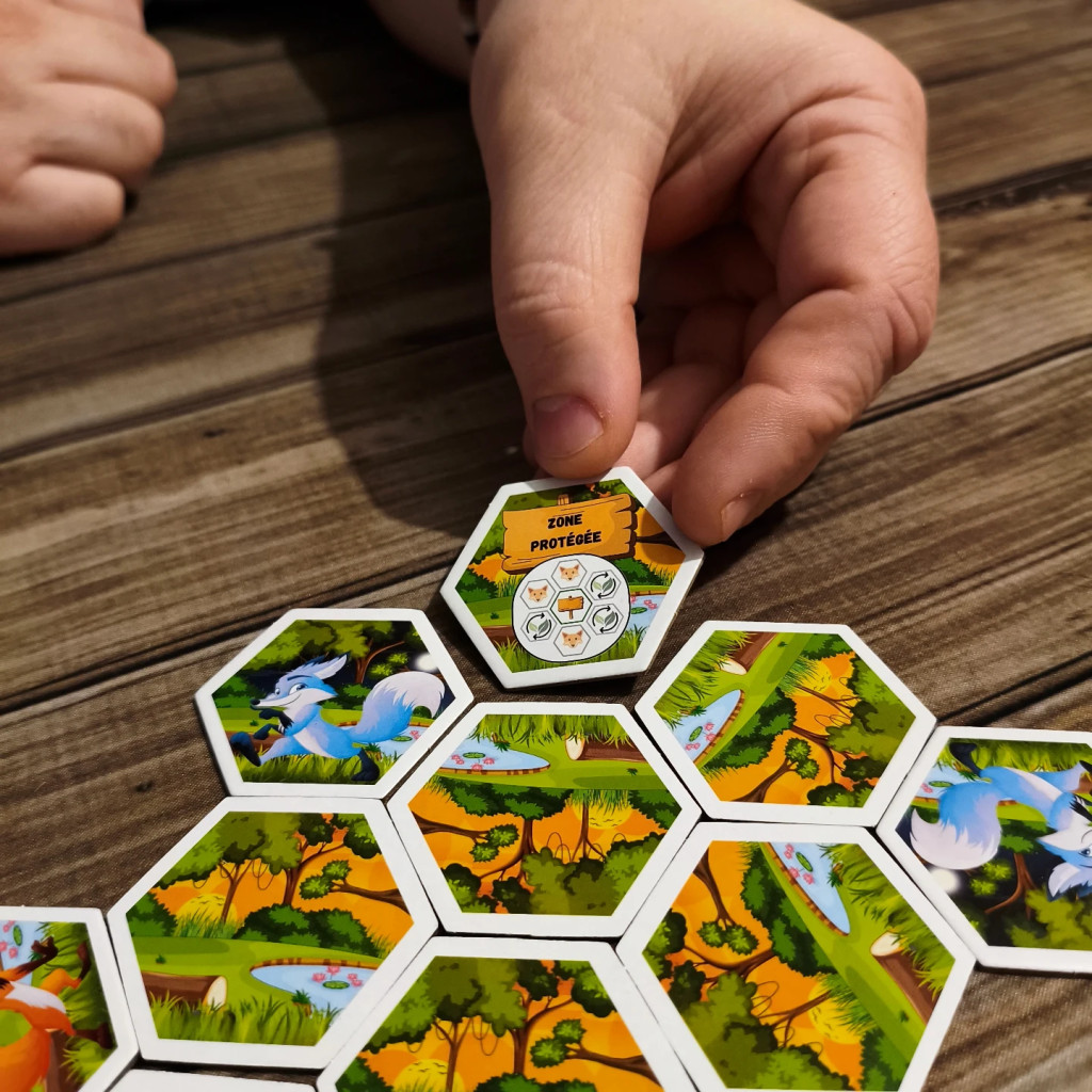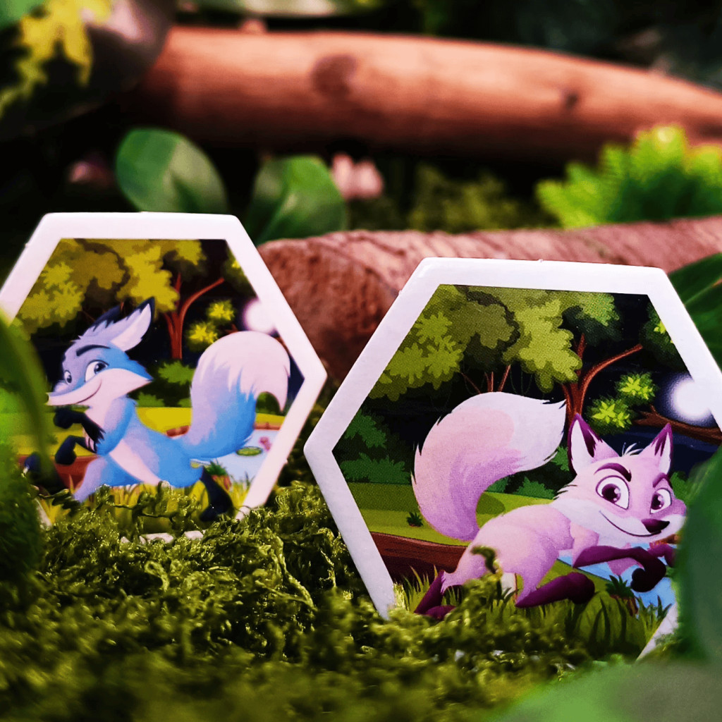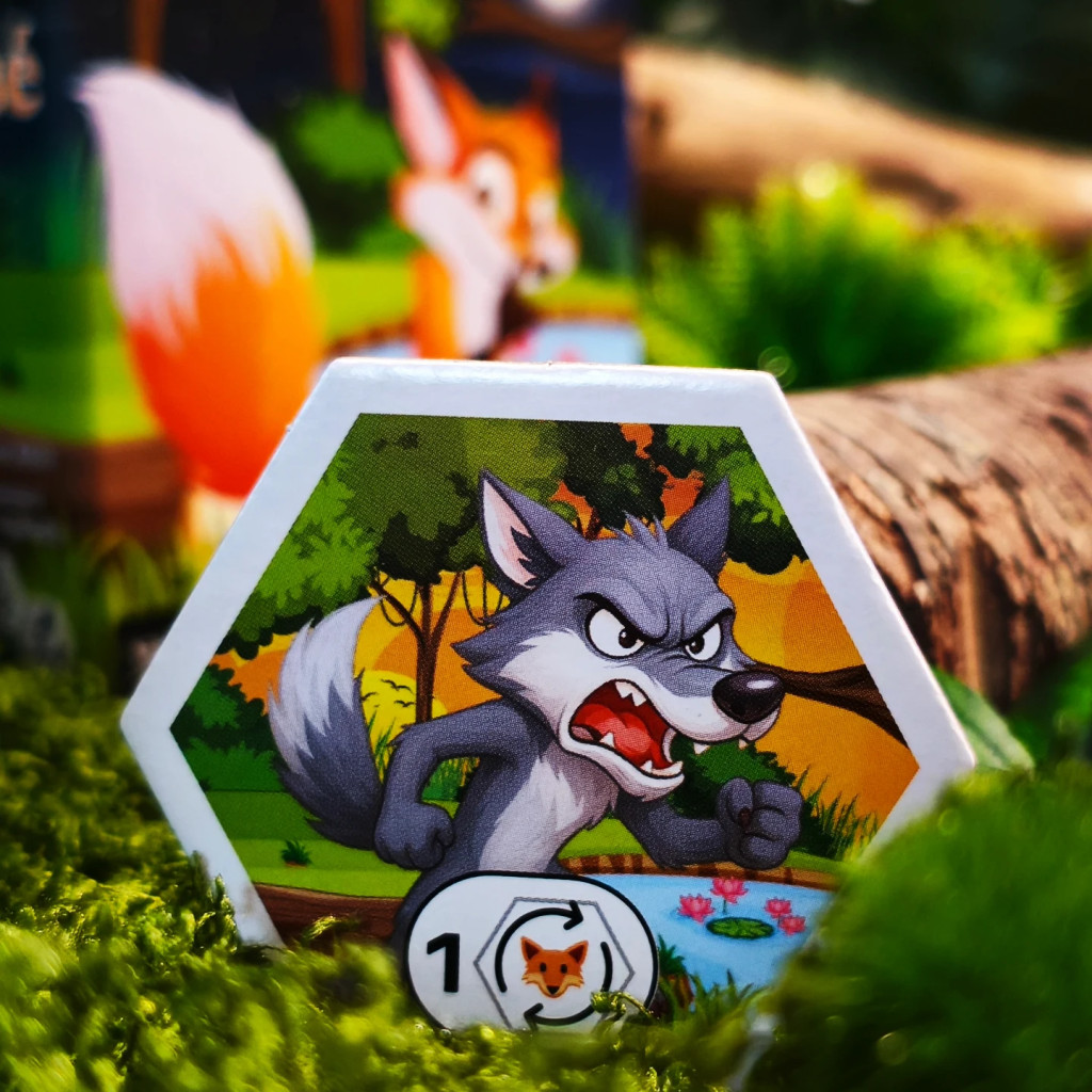 - or flip 1 nature tile if it has exactly 3 adjacent foxes. If an event tile appears, apply its effect and reposition it to nature side up.