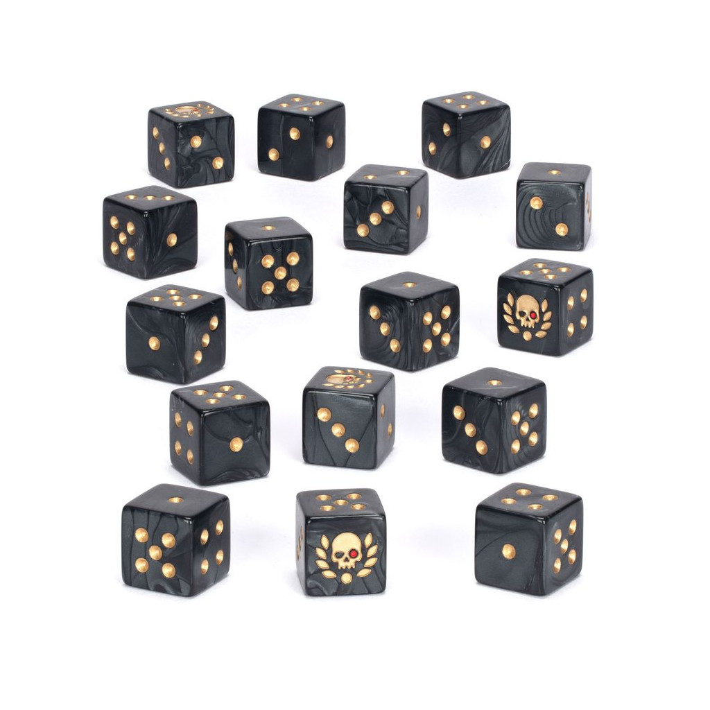 This is a set of 16 six-sided dice with squared edges for use in games of Warhammer 40,000, themed around Commissar Yarrick. They are cast in pearlised black acrylic plastic with gold and metallic red ink markings, and measure 16mm along each edge. The 1-5 facings are traditionally pipped, and each '6' face is decorated with the inspirational icon of Commissar Yarrick. These themed dice are only available while stocks last.