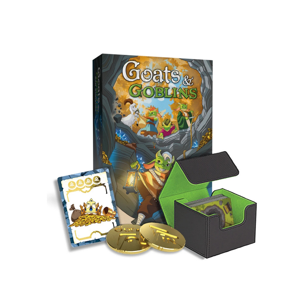 Goats and Goblins is a push-your-luck game where you will attempt to collect treasures, goats, and goblins from the mysterious cave before it collapses. You will take turns leading expeditions below the surface, inviting other players to join you or stay behind. If your mission is successful, the exploring members will gain valuable cards to divide. Failed expeditions will give cards to the players who did not explore the cave. Some cards can be played to support or hinder expeditions.