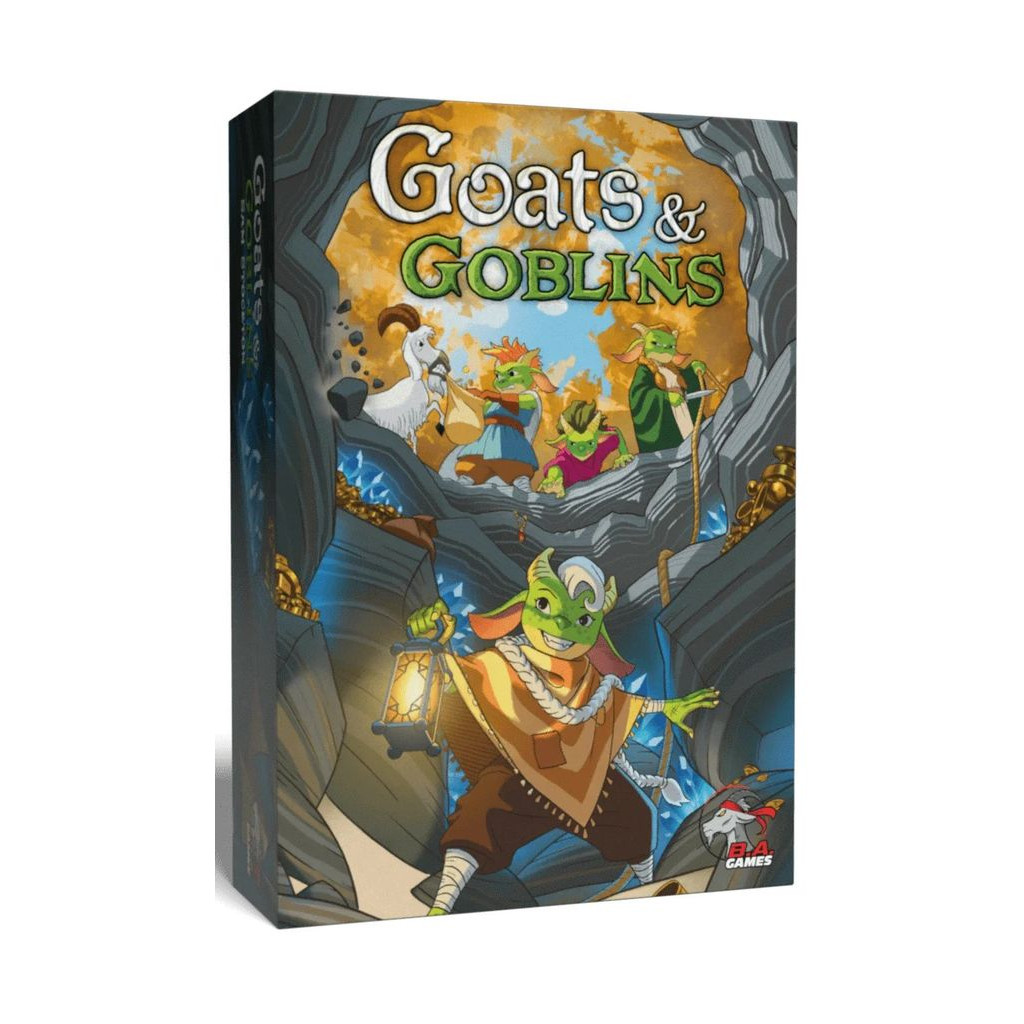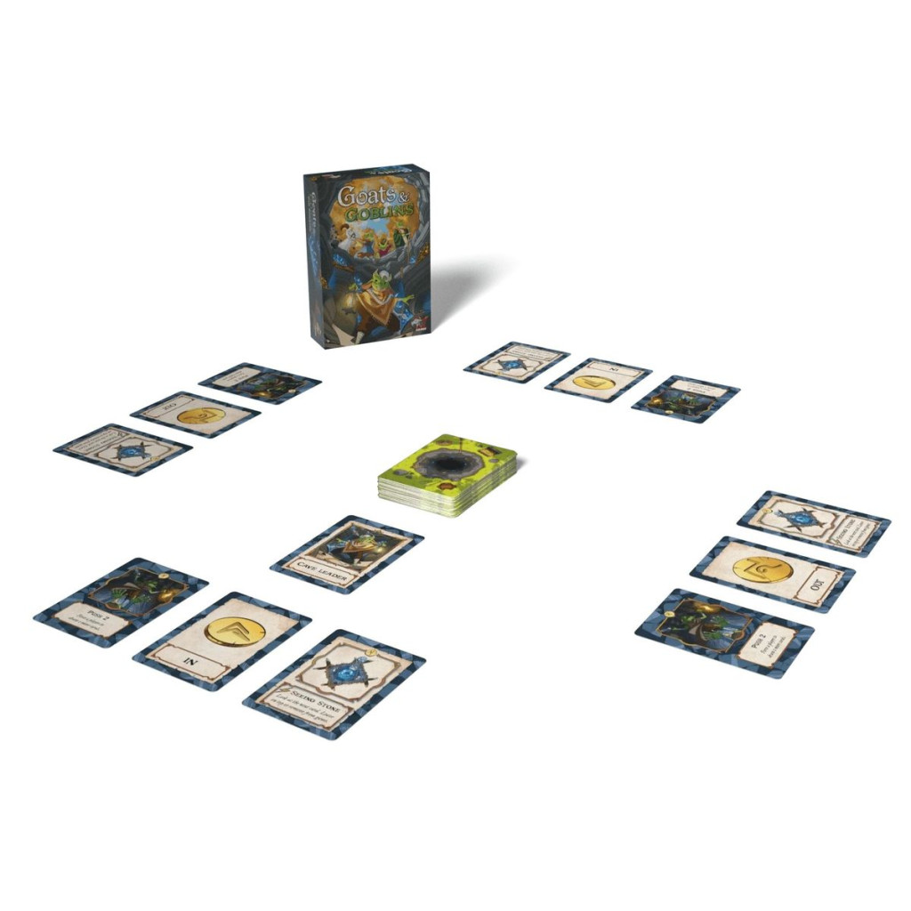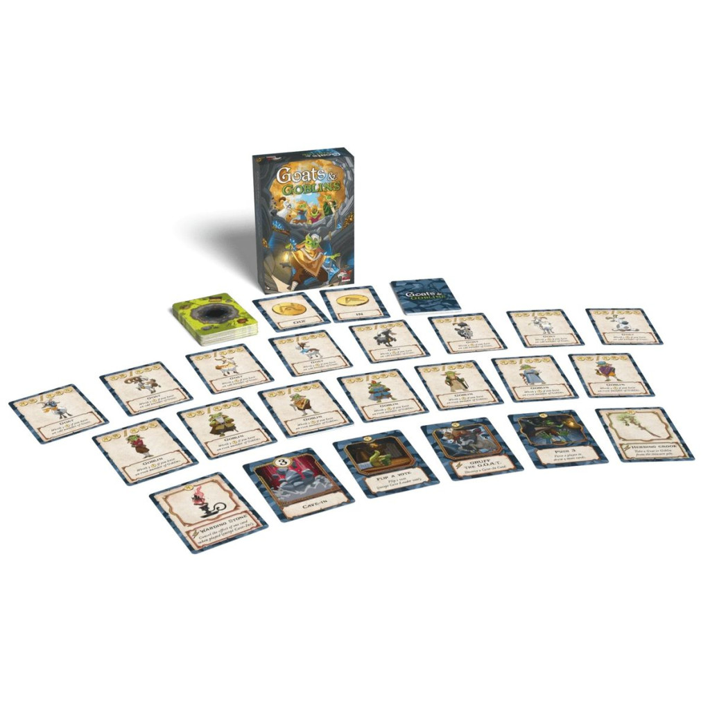 Goats and Goblins is a push-your-luck game where you will attempt to collect treasures, goats, and goblins from the mysterious cave before it collapses. You will take turns leading expeditions below the surface, inviting other players to join you or stay behind. If your mission is successful, the exploring members will gain valuable cards to divide. Failed expeditions will give cards to the players who did not explore the cave. Some cards can be played to support or hinder expeditions.