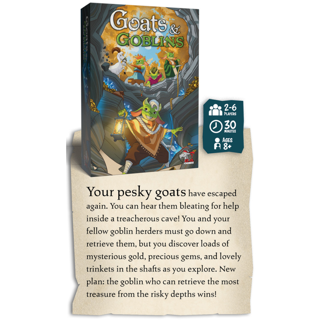 Those pesky goats have escaped again and are now bleating for your help from inside a treacherous cave! You and your fellow goblin herders must go down and retrieve them, but you soon spot mysterious gold, precious gems, and lovely trinkets in the shafts below. New plan: the goblin who can retrieve the most treasure from the risky depths wins! But be careful - going too deep may cause too many Cave-Ins and force you to drop your treasure as you flee, leaving it unguarded for the saboteurs to take.
