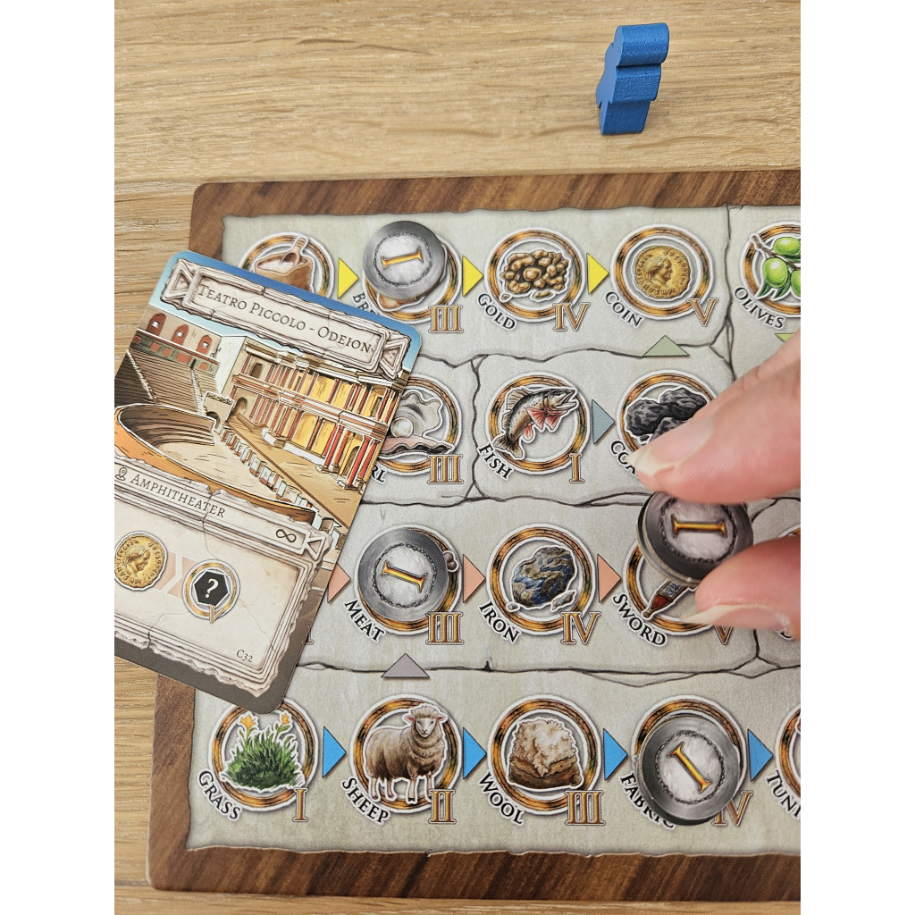 While you grow your part of the city, others are doing the same. Each player has their own vision for Pompeii’s future, and everyone’s progress is interwoven. The most successful leader will station their army at the Castrum, the military camp outside the city gates, taking control of the city’s fate.