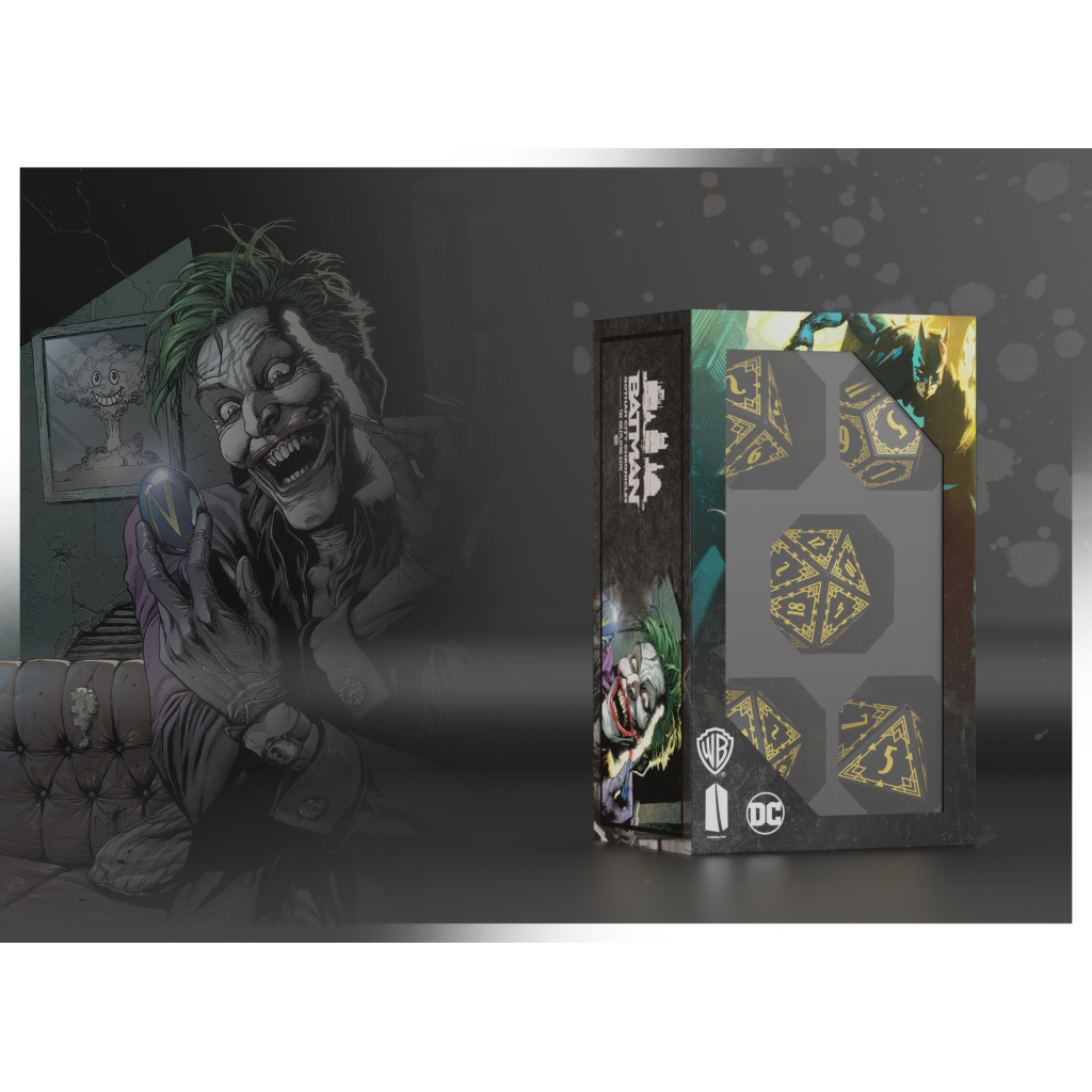 A set of nine engraved “hero”-style dice in black and yellow, featuring the Batman logo replacing the highest number on each die. This set includes all dice needed for a scenario, comprising one four-sided die, two six-sided dice, two eight-sided dice, one ten-sided die, one twelve-sided die, and two twenty-sided dice.
