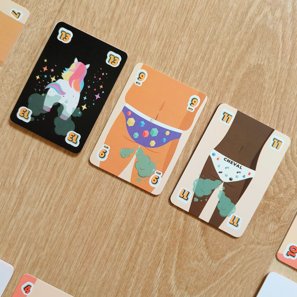The concept? Place your cards on one of the three piles according to their value... but watch out for twists and turns! Between the UNICORN cards that serve as jokers and the INTOX cards that force you to make a farting noise to activate their effects, a lively atmosphere is guaranteed!