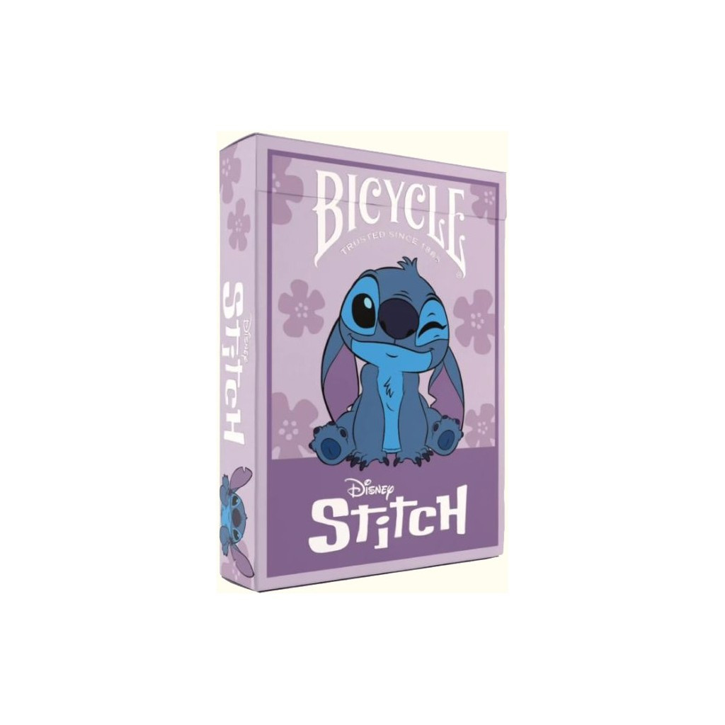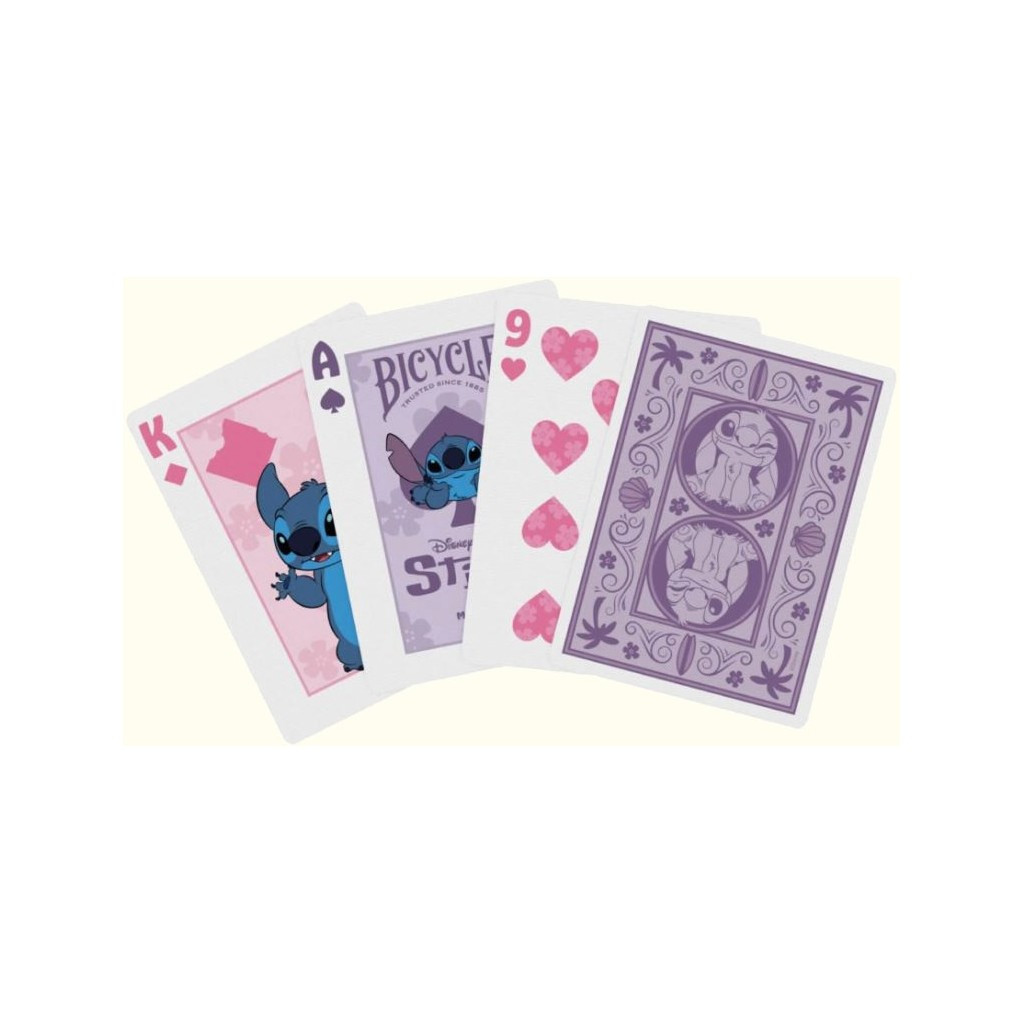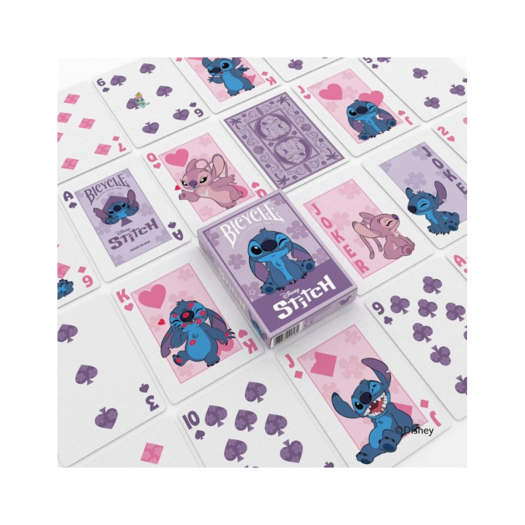 Artwork of Stitch tears through the tuckbox and into our hearts with Disney Stitch Inspired Playing Cards by Bicycle. Bring the Hawaiian magic of Ohana home to your family! Experiment 626 is causing mischief throughout the 54 cards, along with his "boojiboo" Angel on the court cards!