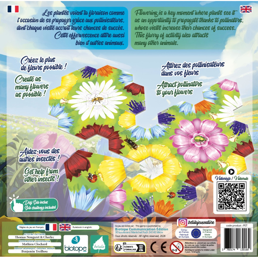 When a flower is formed, add a pollinator of the same color to its center and continue, on your next turn, to expand your flower bed by connecting other petals (tiles).