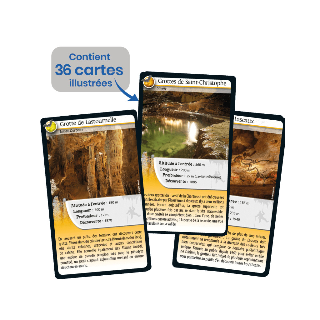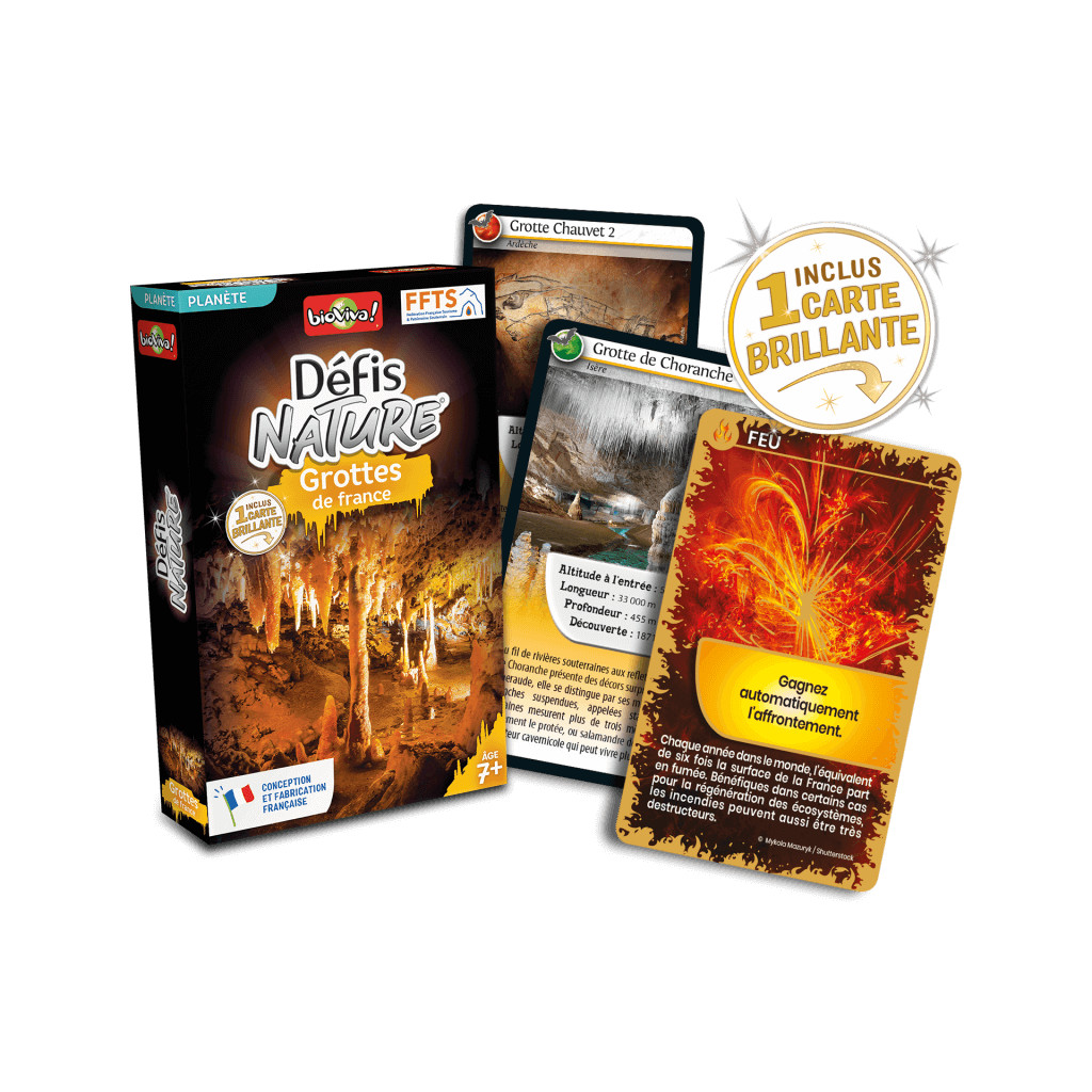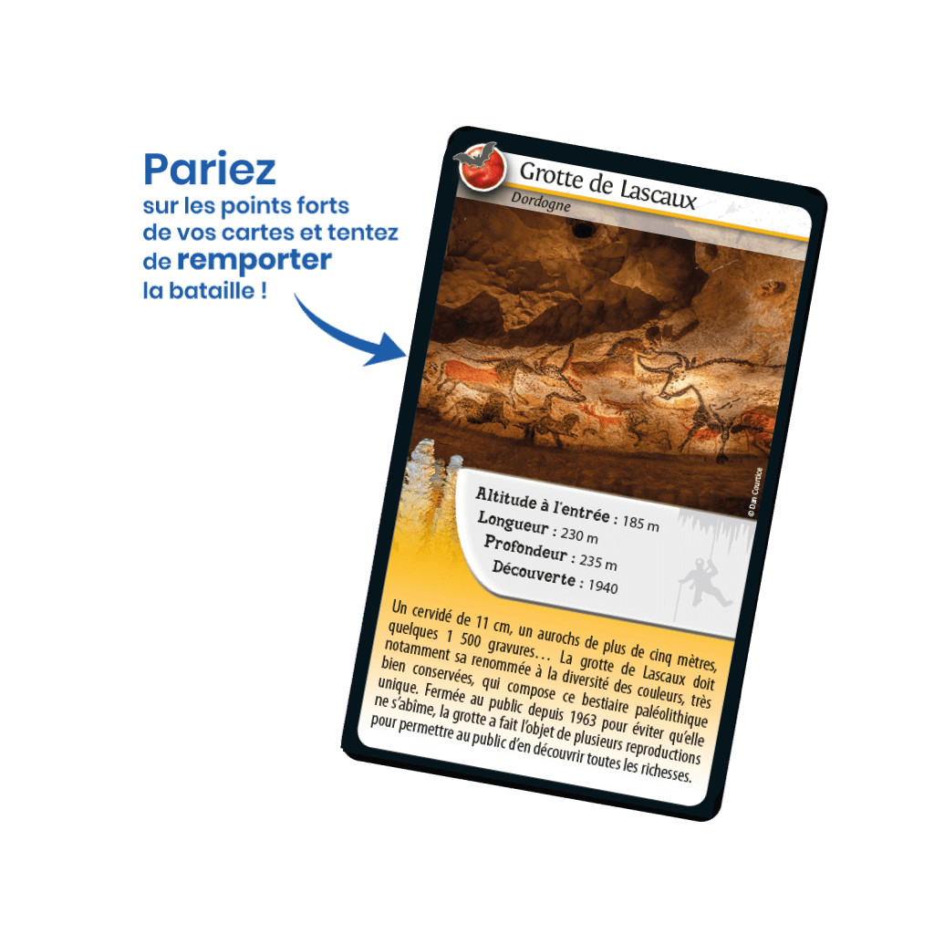 Défis Nature – Caves of France takes you to explore the most beautiful caves in France! Discover their unique features, then bet on their characteristics to collect all the cards and win the game. So, are you ready to take on the challenge?