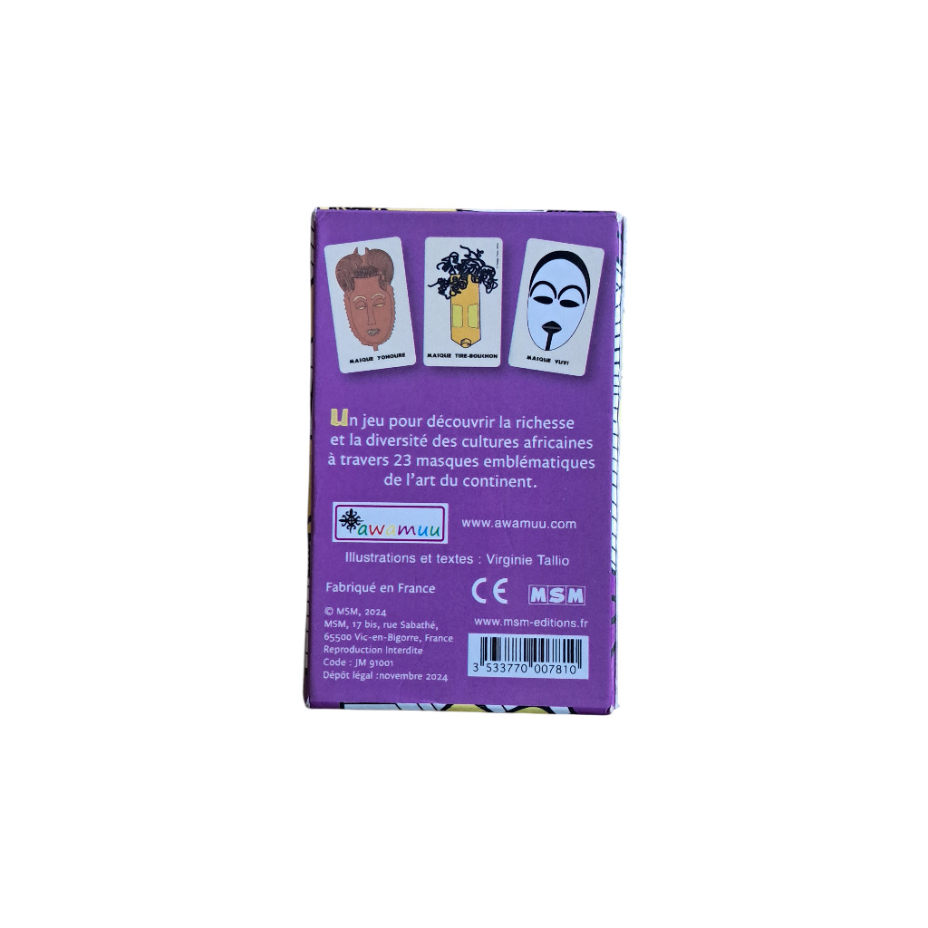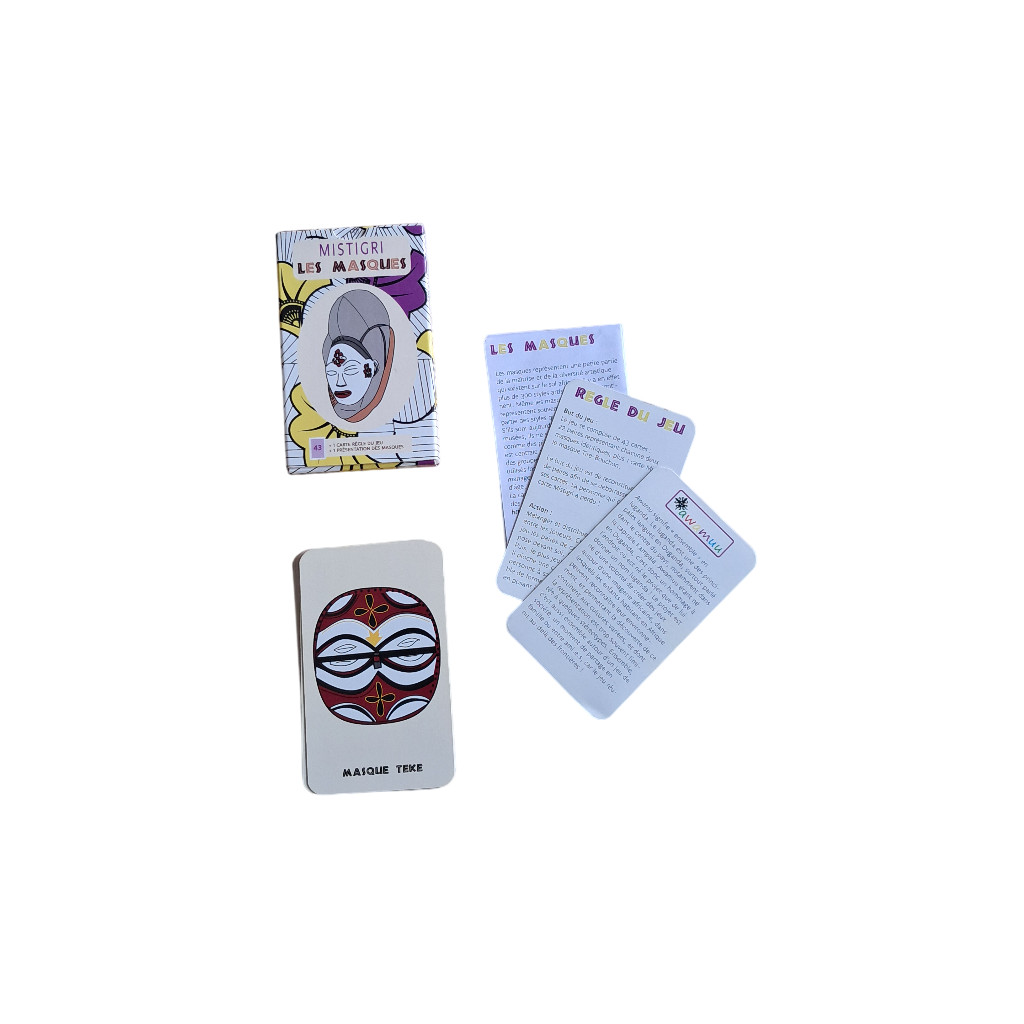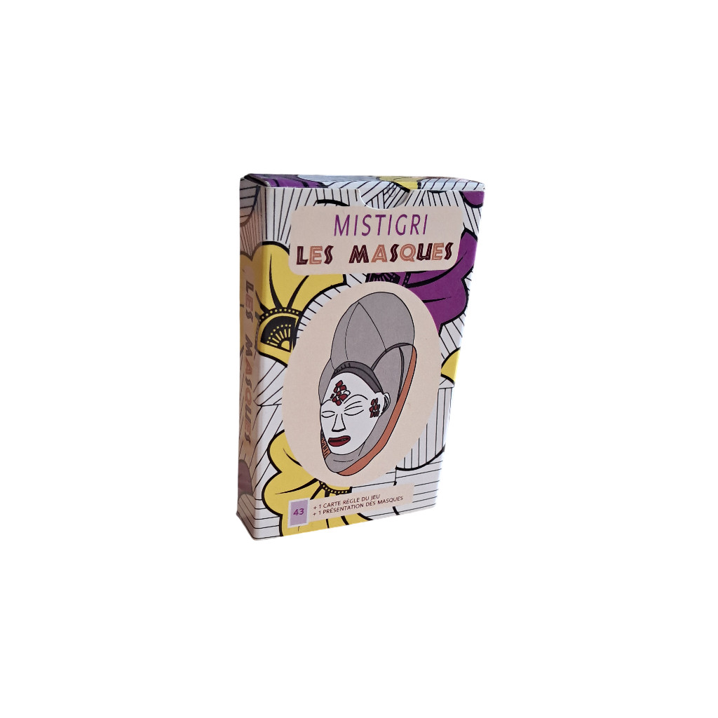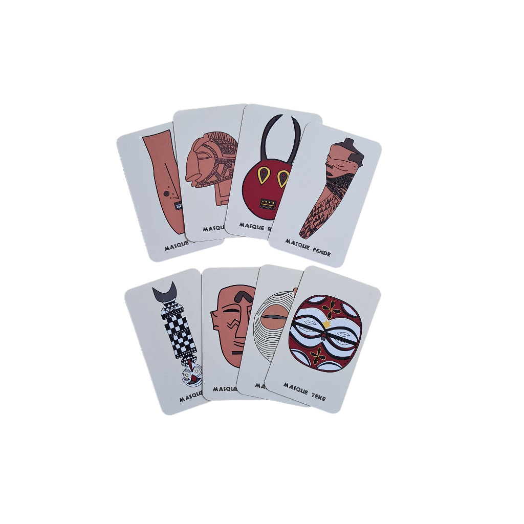 This Mistigri game is illustrated with pairs of masks from different African countries. Mistigri is represented by the Tire-Bouchon mask, a work by Beninese artist Romuald Hazoumè.