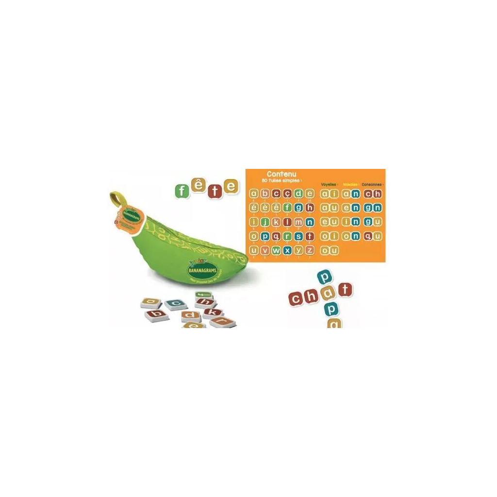 Bananagrams Junior contains 80 lowercase letters, some with accents and cedillas, and 13 double tiles with common letter combinations to help build words. Consonants that are often confused (p/b, b/d, p/q, etc.) each have their own distinct colors! While waiting to be able to create word grids, Bananagrams Junior offers 12 mini letter games that are perfect for discovering the alphabet, reading, and writing! Play alone or with others :)