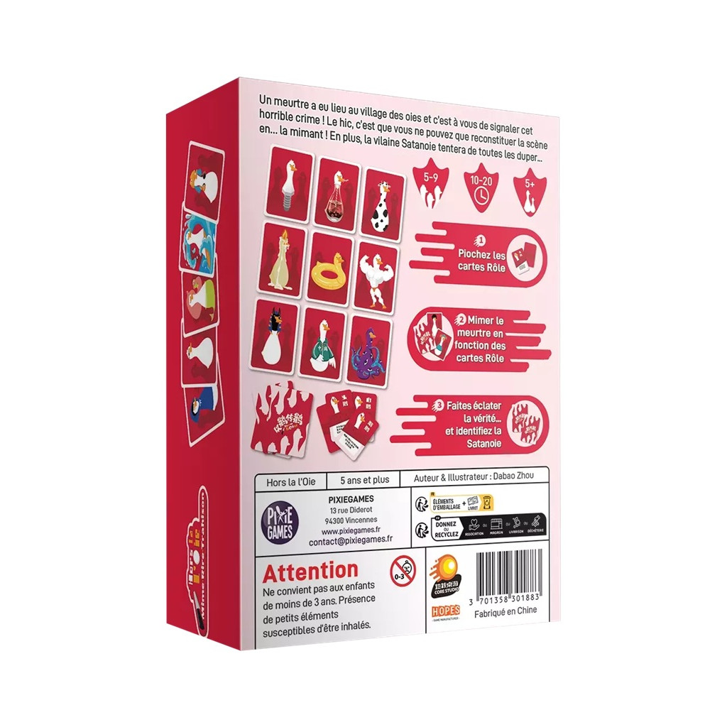 The Dragon Goose has killed the shy Banana Goose! The witness must use their creativity and wake up their neighbor to mime the terrible scene... Was it a T-Rex goose that killed the poor Falbala Goose, or a Mexican goose? It's hard to say...