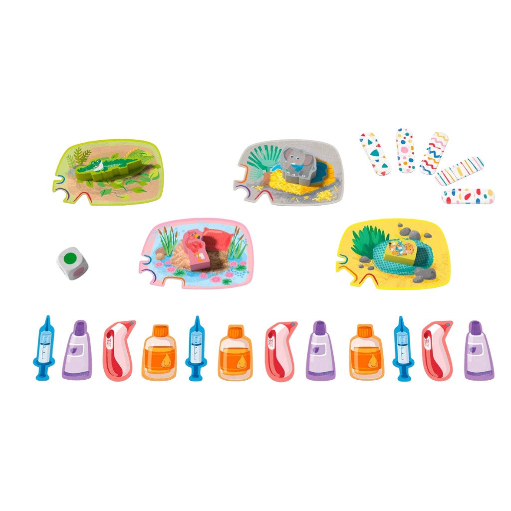 - 4 animals (cheetah, crocodile, elephant, flamingo), 1 die, 4 sleeping spots (= shelves), 12 medicine packs (fever juice, syringe, hot water bottle, thermometer), 5 comfort bandages, 1 set of game rules.