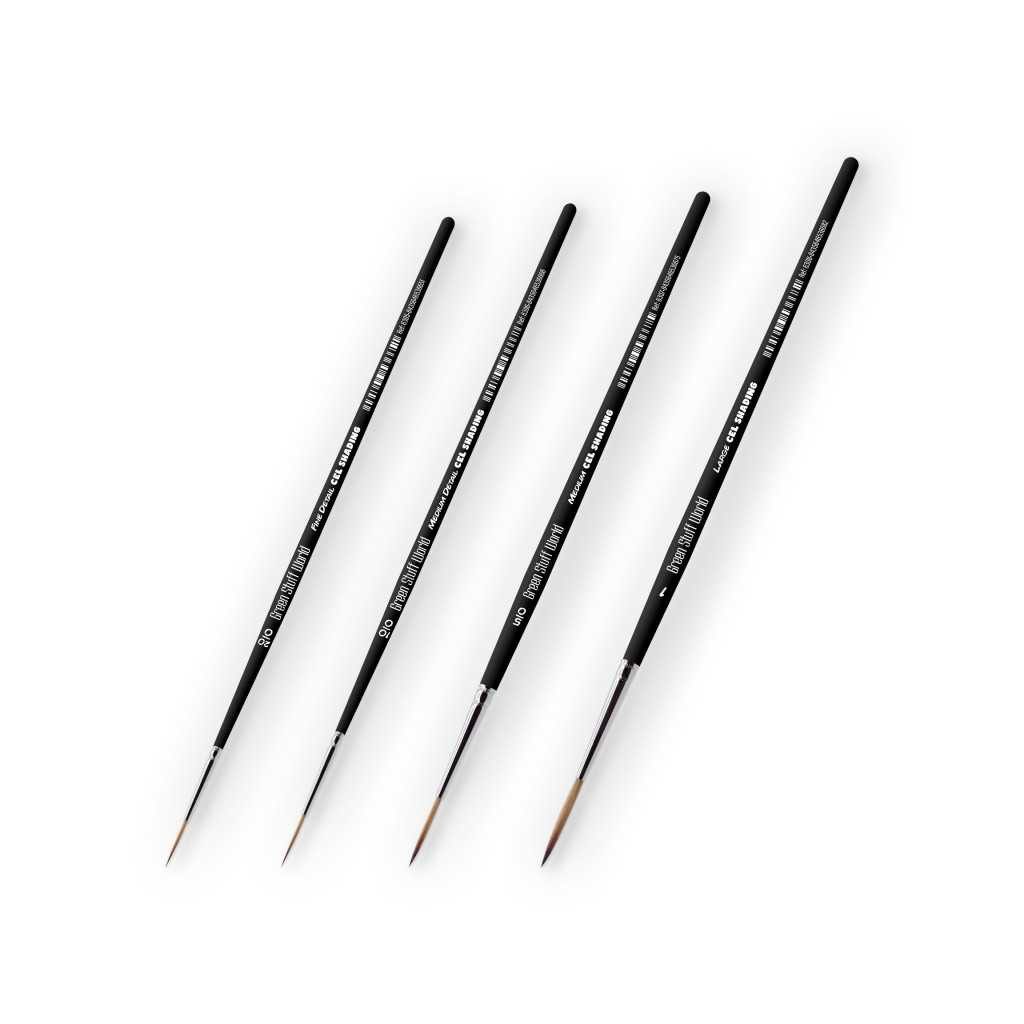 The main feature of these brushes is their extremely fine and elongated tip. Thanks to this shape, they allow for a greater paint load and a continuous, precise, and stable stroke. This greatly facilitates tasks such as outlining contours, applying flat shadows, highlighting facial expressions, and marking details with great control, without the bristles deforming during the process.