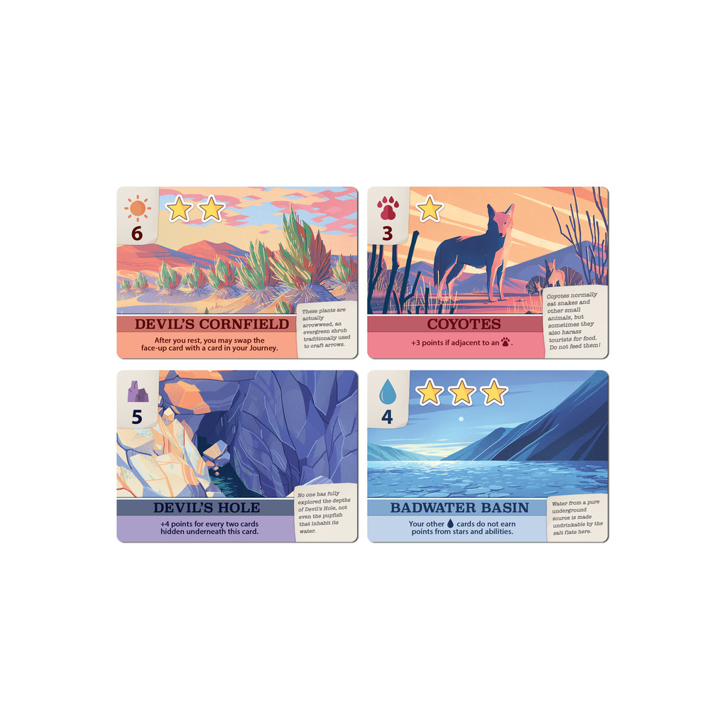 Each turn, players will choose whether to assign a card to their Journey, or move cards from their Journey to their Scrapbook. Cards feature stars (points), special abilities (affect the value and position of cards), and some interesting facts about Death Valley.