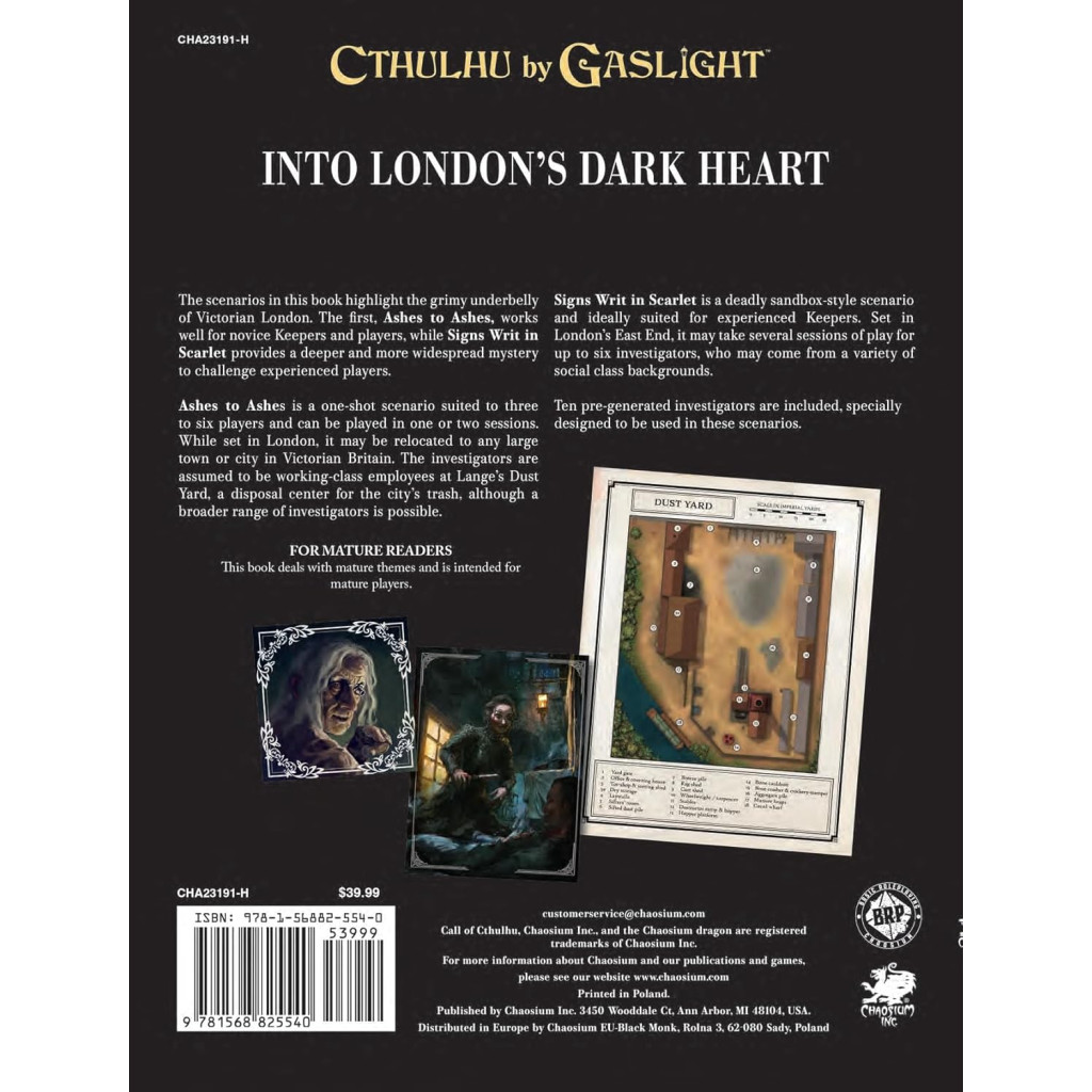 The scenarios in this book highlight the grimy underbelly of Victorian London. The first, Ashes to Ashes, works well for novice Keepers and players, while Signs Writ in Scarlet provides a deeper and more widespread mystery to challenge experienced players.