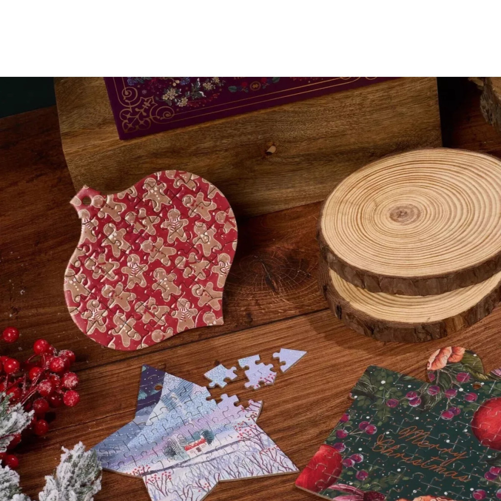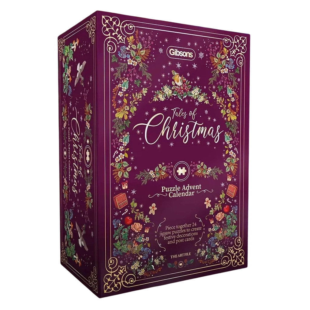 The Art Files Advent Calendar - Tales of Christmas: 24 Mini Puzzles includes 24 cardboard puzzles with festive images, puzzle glue, and ribbon to turn each puzzle into a pretty Christmas decoration to hang up or a greeting card.