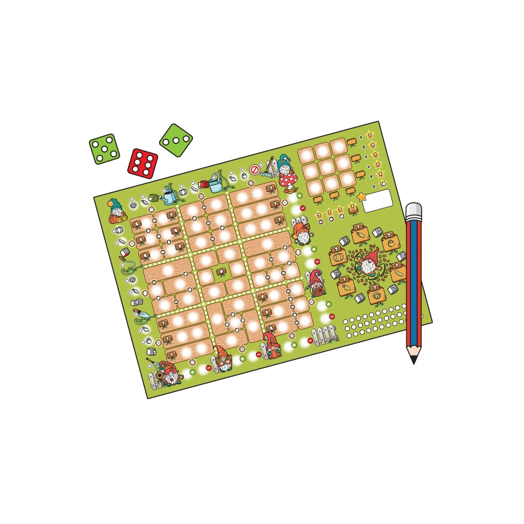 Gnomes Garden is a Roll and Write game. You become a gnome farmer that was given a task to feed the whole gnome village. Grow your plants, acquire various gardening tools that will help you with the job, allowing you to mitigate dice results, and try to satisfy the tastes of your gnome neighbors.