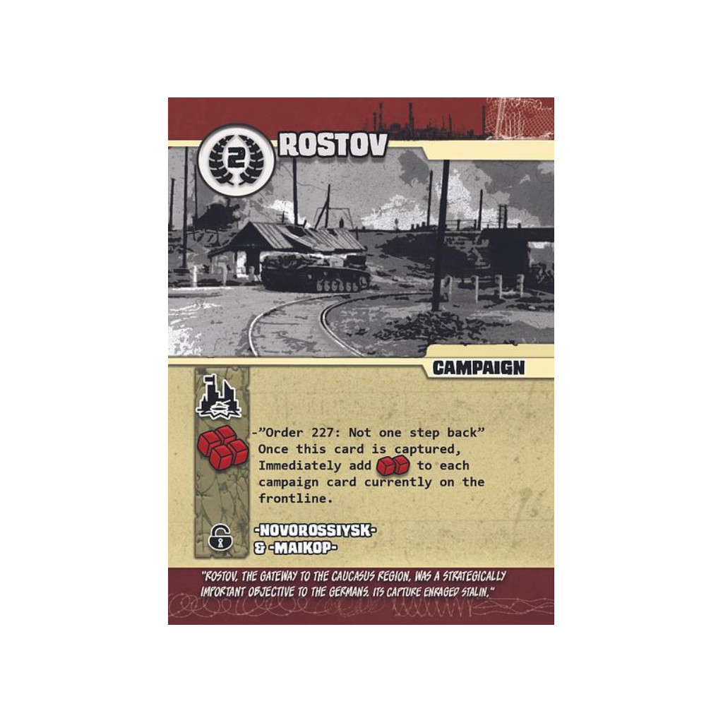 One month turns. Decide which card (objective) to go after, each with a unique set of Soviet defences. Manage supplies required for each offensive, or choose to take an operational pause. Receive random event cards that are mostly beneficial but a few are Soviet counterattacks that can throw a serious monkey-wrench into your plans.