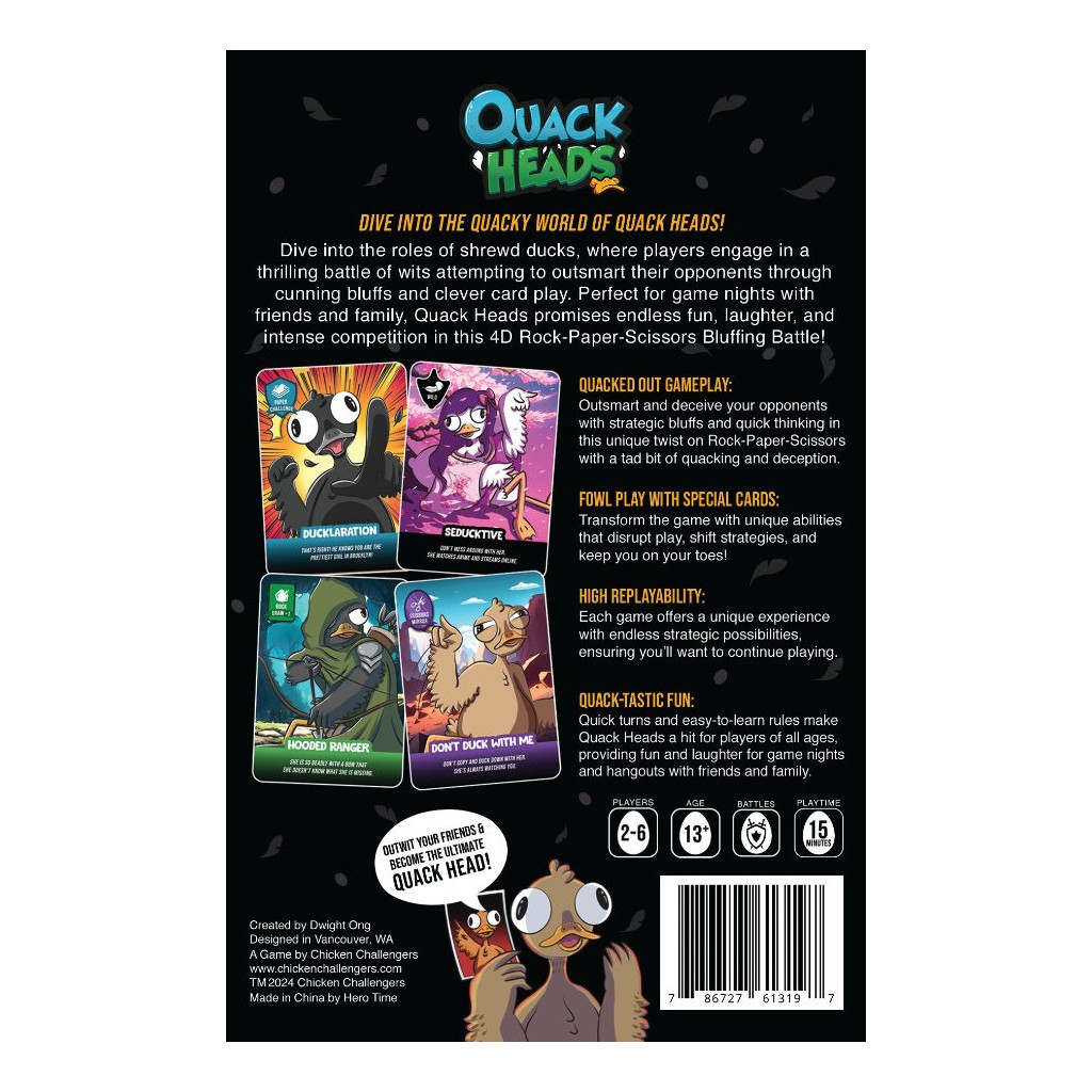 Whether you're playing with children, teens, or adults, Quack Heads is designed to be inclusive and enjoyable for everyone. The game's humor, dynamic theme, and easy-to-understand rules make it ideal for family nights, holiday gatherings, travel, camping, or casual get-togethers.